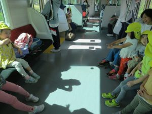 電車に乗っていたときのこと、左側に座っている子どもたちが影で遊んでいるのを見て、右側にいる子どもたちもやってみようとしますが、映らず不思議に思っていると、年長の子が「太陽がこっち(左)にあるからそっち(右)はうつらないんだよ」と話しました。自分の経験から他の子にも伝える姿がありました。