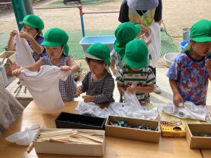 模様をつけたTシャツを水に浸し、クロモジを煮だしている間に、クロモジの葉を手に取り触ったり匂いを嗅いでみます。園庭中に、クロモジの良い匂いがします。