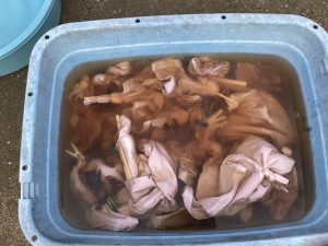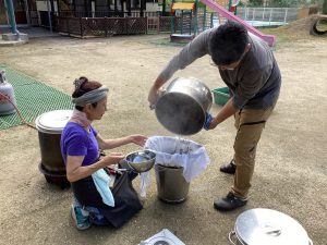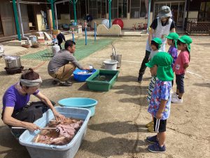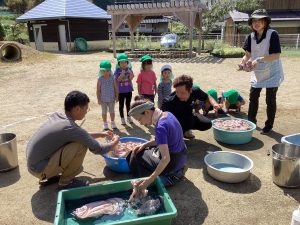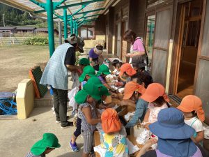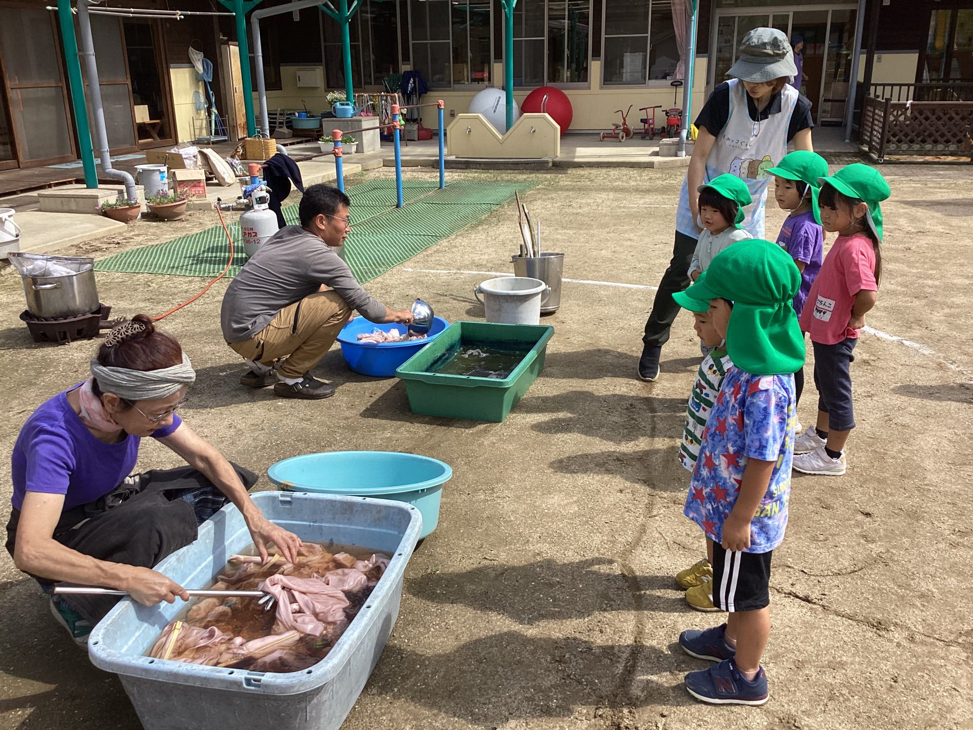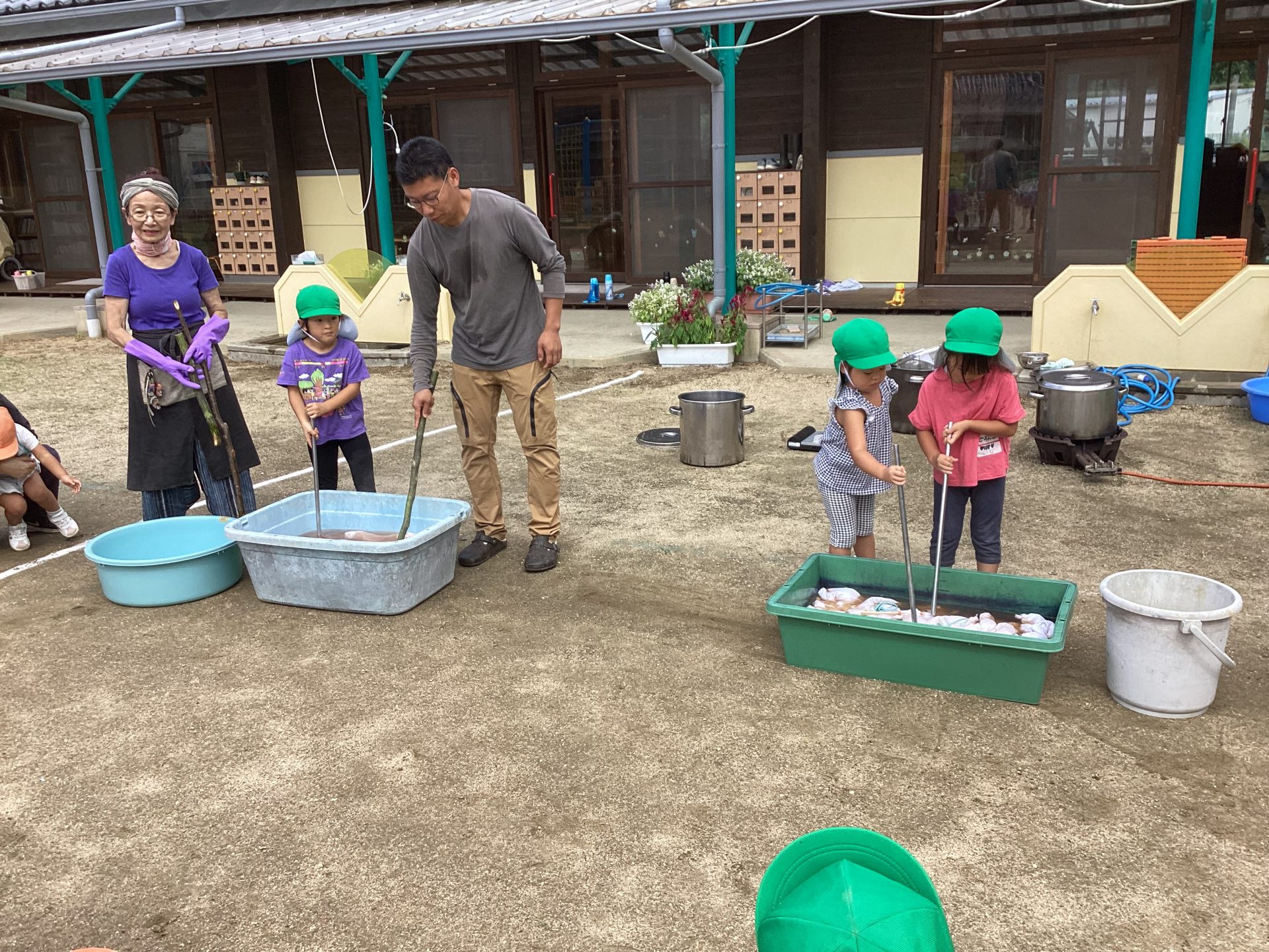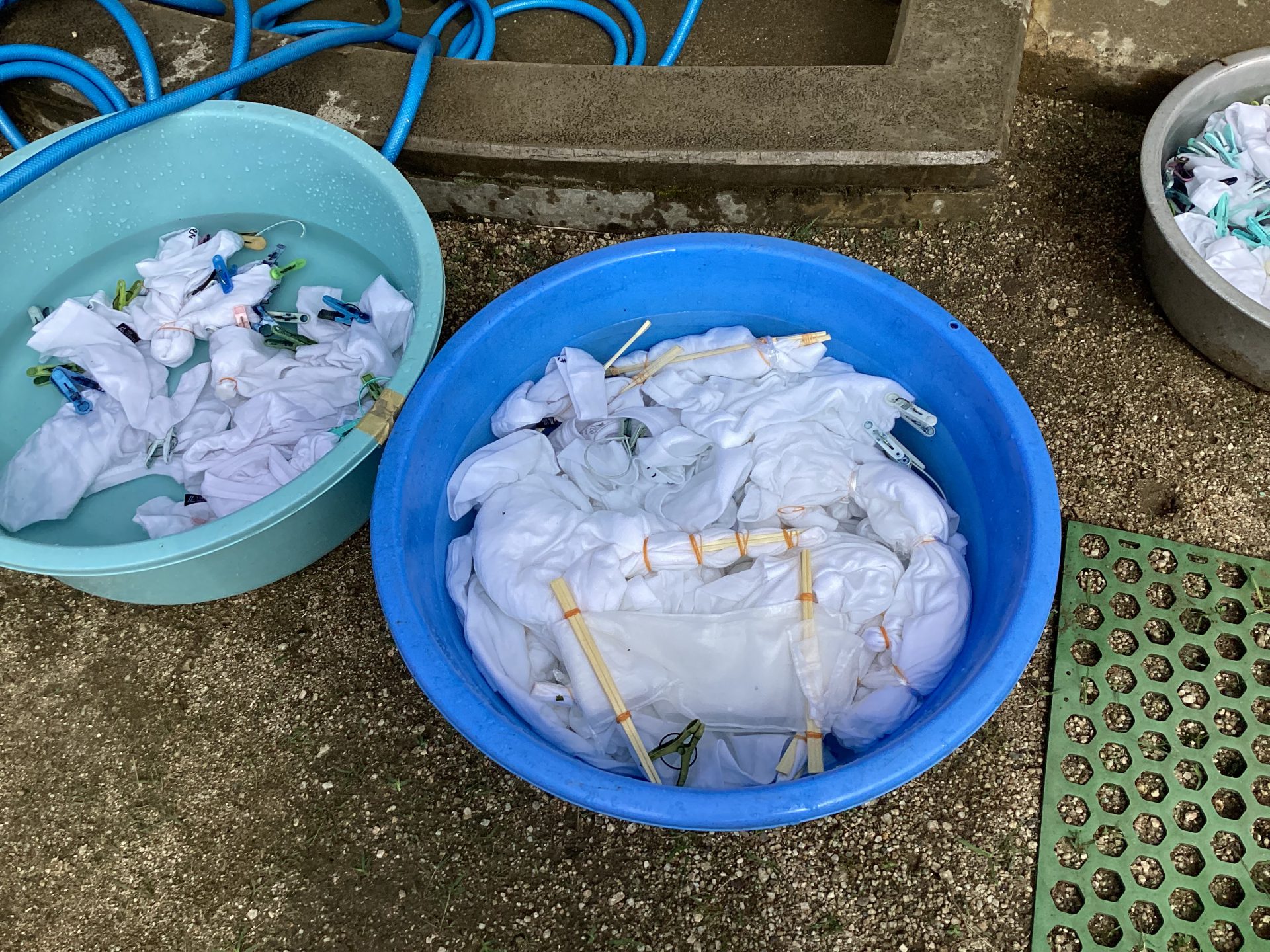子ども達が楽しみにしていた、野菜の売り上げで買ったTシャツで行う草木染の日がやってきました。準備の様子を部屋から見ながら、「まだかな」「いつやるの」とソワソワ・ワクワクしています。
