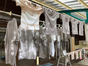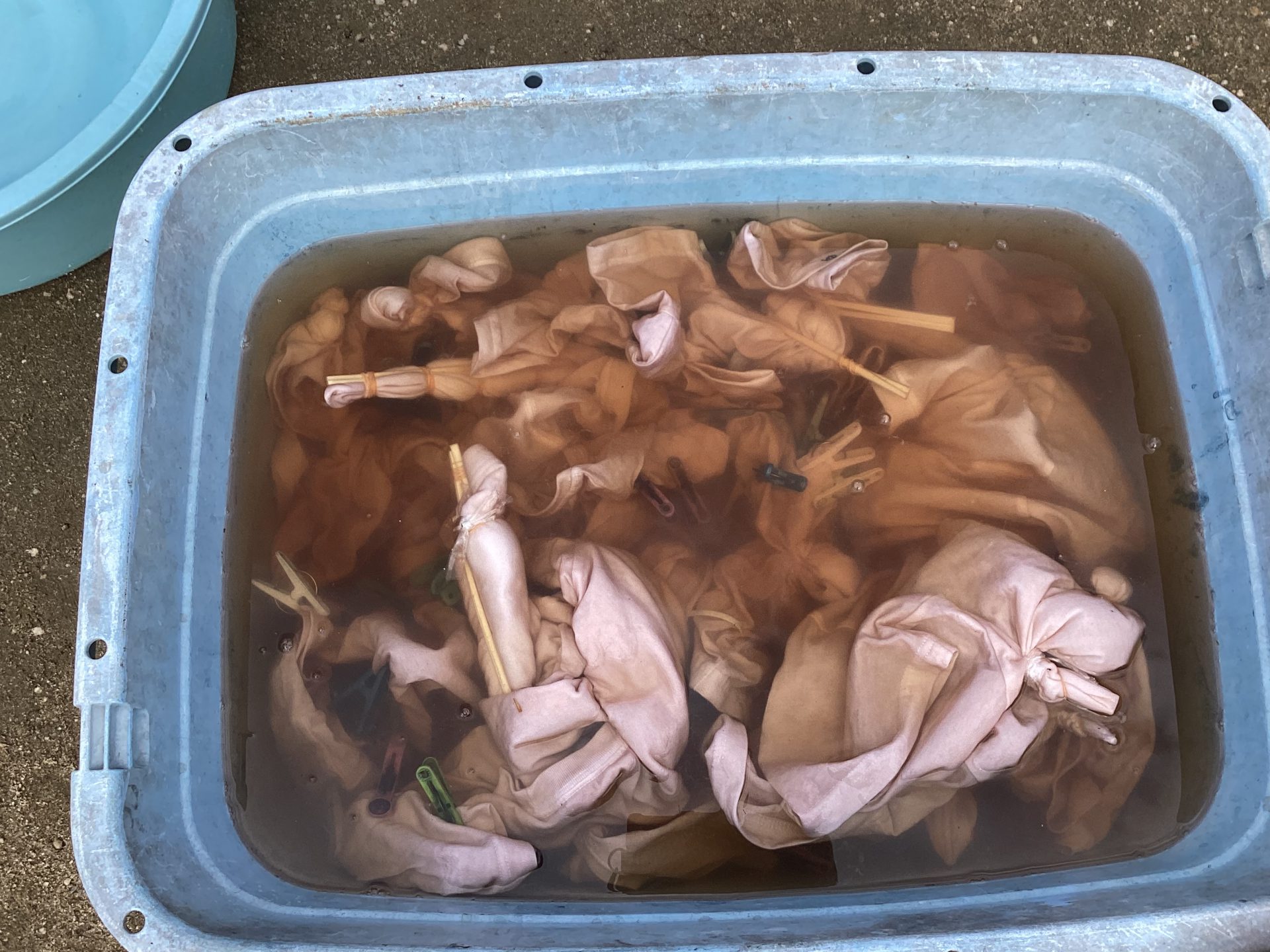 と、煮出したピンク色の液に浸したTシャツを、銅と鉄の媒染液にそれぞれ浸けると2色の色に染まります。銅媒染したTシャツは、元のピンクに近い色、銅媒染したシャツは、淡いグレーになりました。