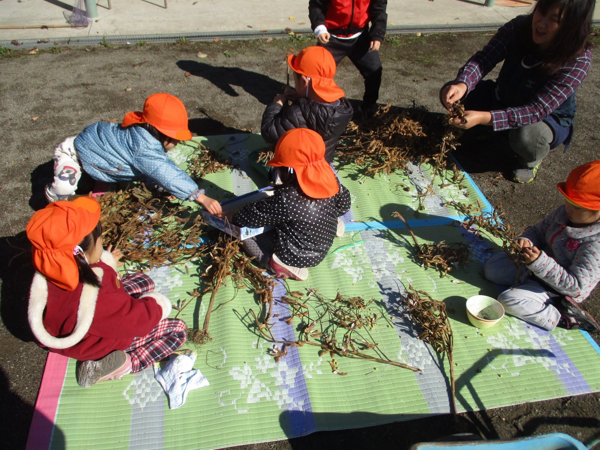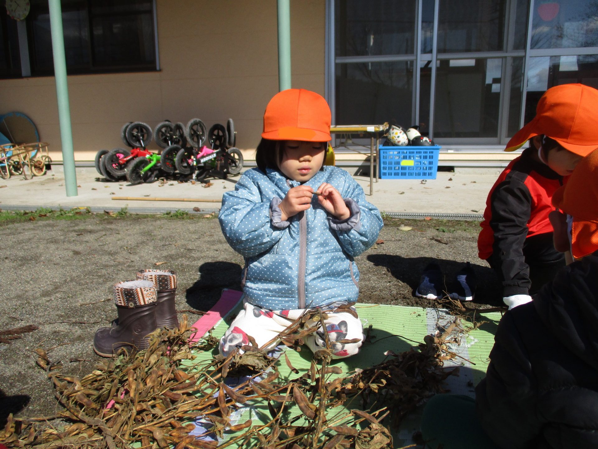 干してあったはずの3才さんが育てた大豆の束が落ちていて、
