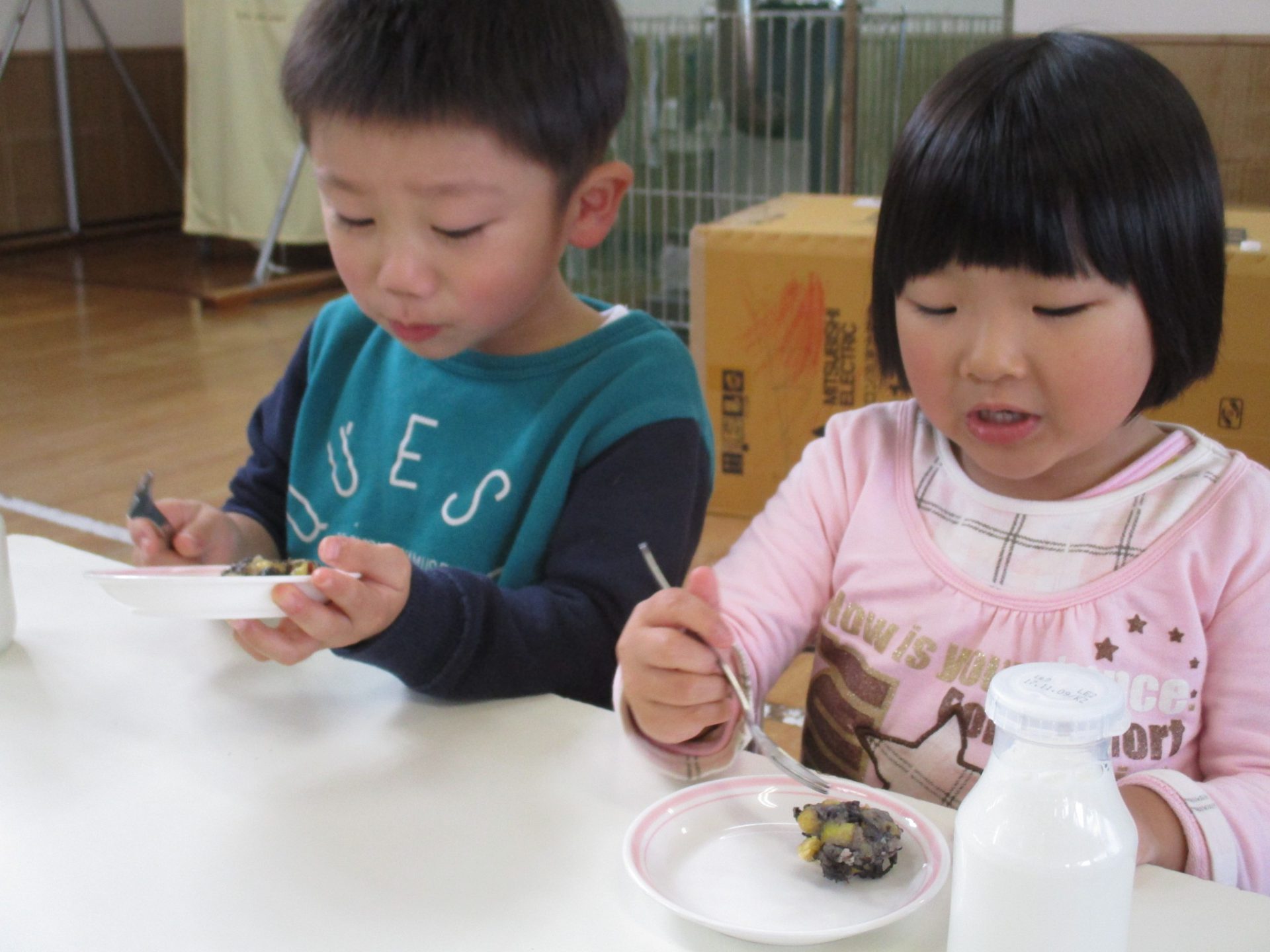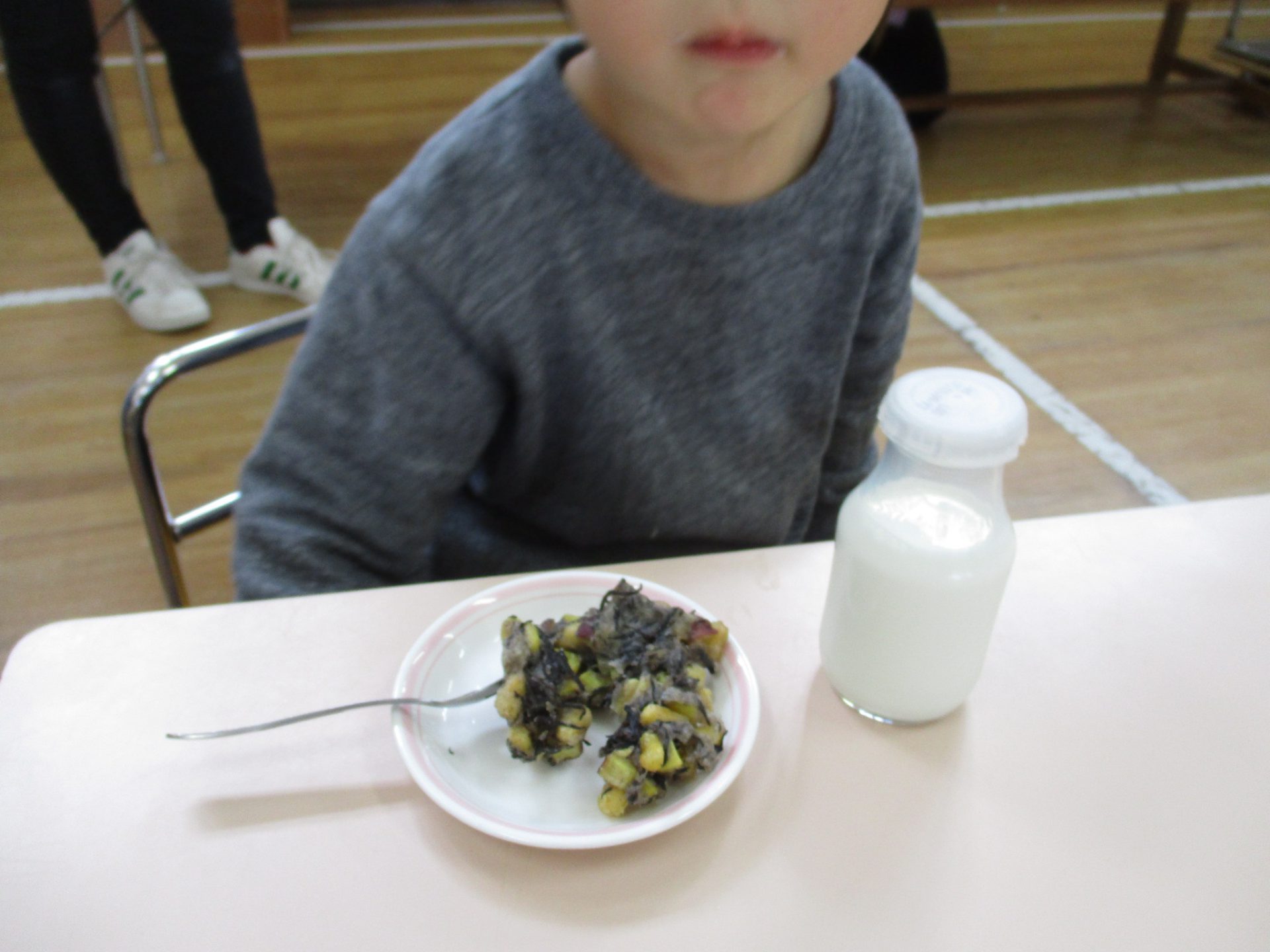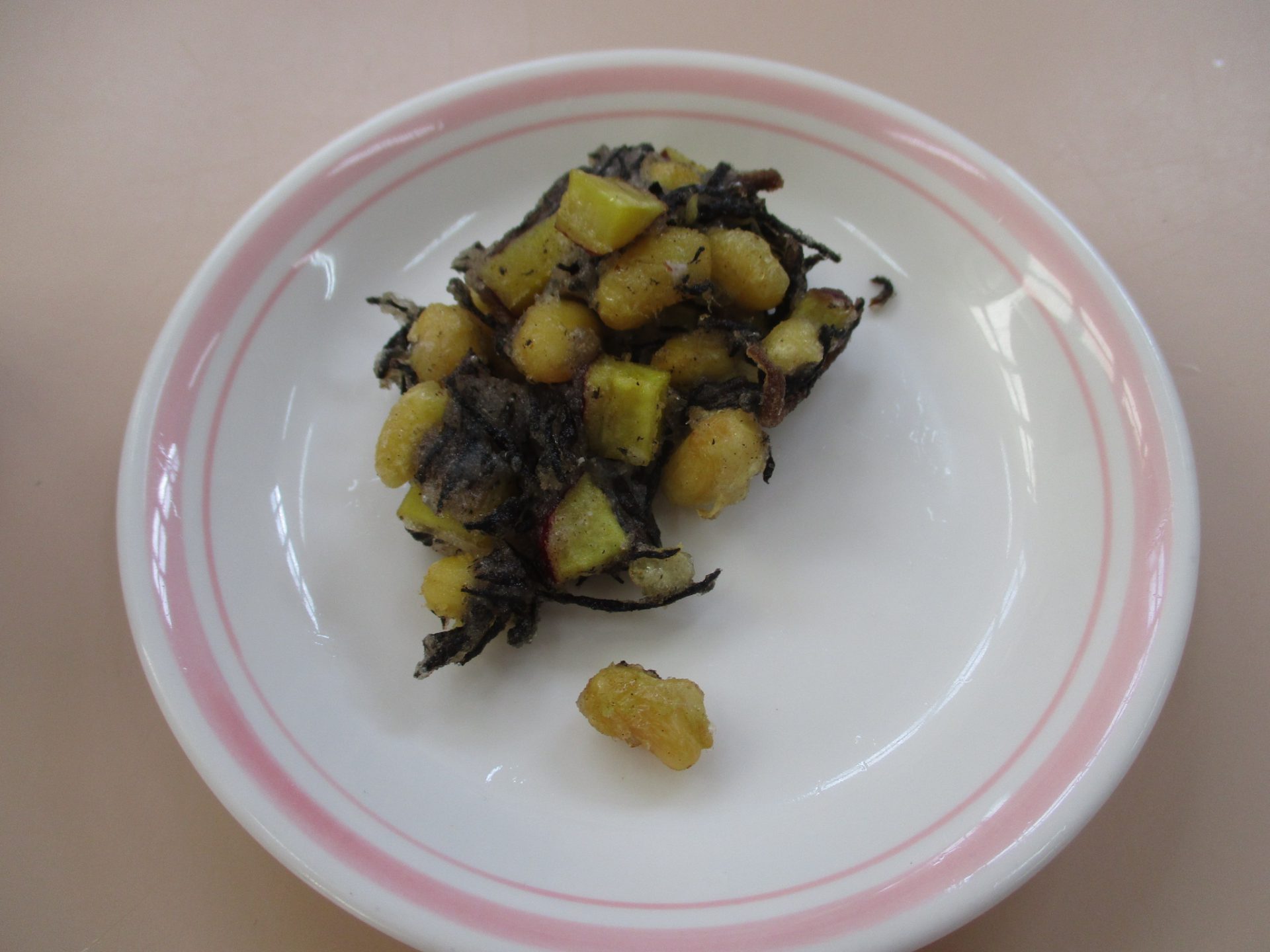 保育園の畑で獲れた、さつまいもと一緒にかき揚げにしてもらいました。