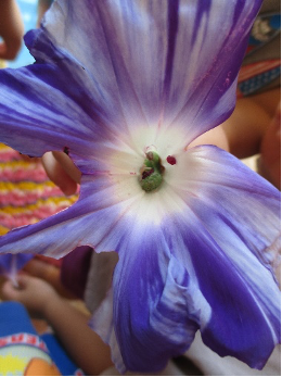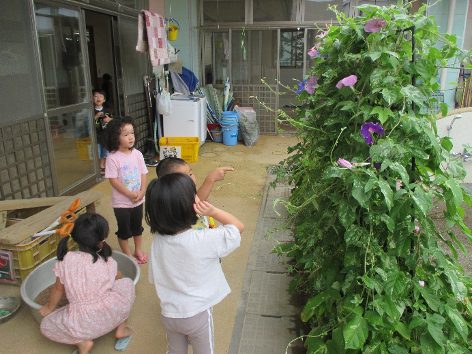 春に種を蒔いた朝顔の花。「まだ咲かないね」と毎日様子を見ながら水をあげていると、いつのまにか子どもたちの身長よりも大きくのびて、花がたくさん咲きました!