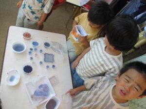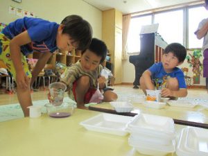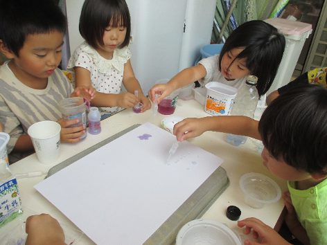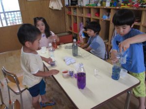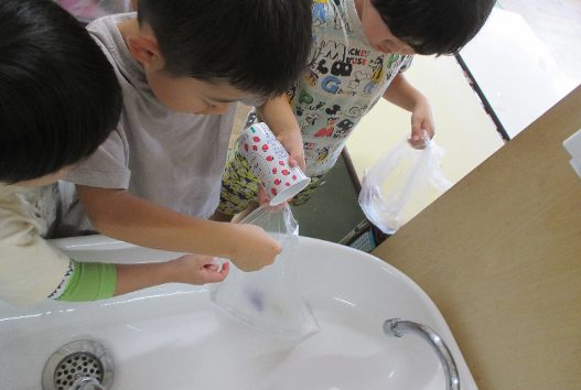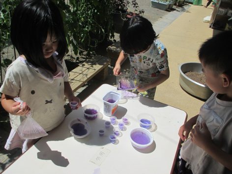 だんだんきれいな色水になってくると、友達と見せ合って色を比べてみていました。