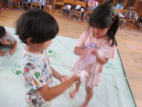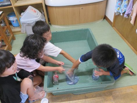 顔に乗せると「冷たくって気持ちいい」耳にあてると「ちゃぱちゃぱって音がする」五感を使って楽しんでいます。