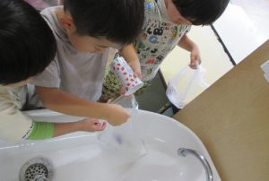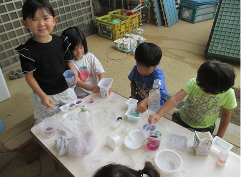 ・色水を作るところから、ごっこ遊びや、色や温度の変化の観察へと、子どもたちの遊びが次々に展開していきました。いっぱいの自然の中で遊び方を工夫したりアイディアを実現したりしながら「やってみたい」「おもしろい」「なんでだろう」をたくさん経験してほしいなと思います。