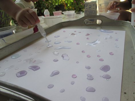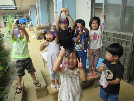 テラスにとっておいた色水を午睡起きに見に行くと、不思議なことが起こりました。