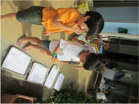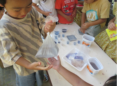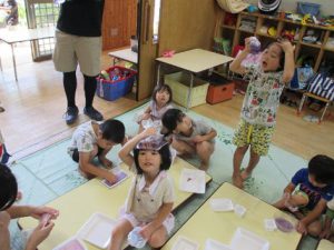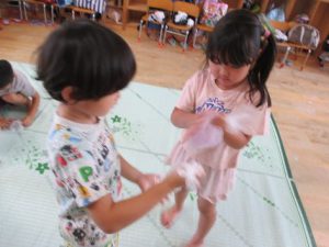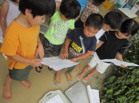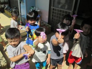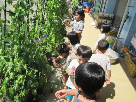 ・「なにしているの?」と見に来た年少組の友達にも、「朝顔使っていいよ」と自分たちで育てた朝顔をすすめたり、やり方を教えてあげたりする優しさに担任はじーんとしました。年中組に進級して半年たち、お兄さんお姉さんらしさが増しています。