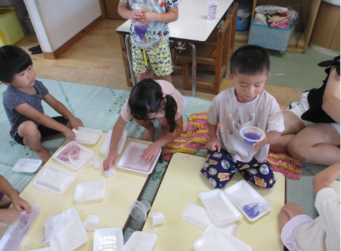 トレーやカップをたくさん持ってきて、入れてみると、「ジュースみたい」「ゼリーみたい」「こっちはぶどう味」とごっこ遊びが始まります。