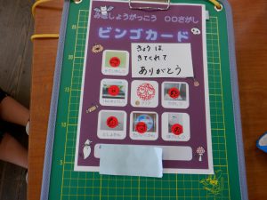 担任の先生のお話を聞いて、学校探検のビンゴカードを配ってもらいました。