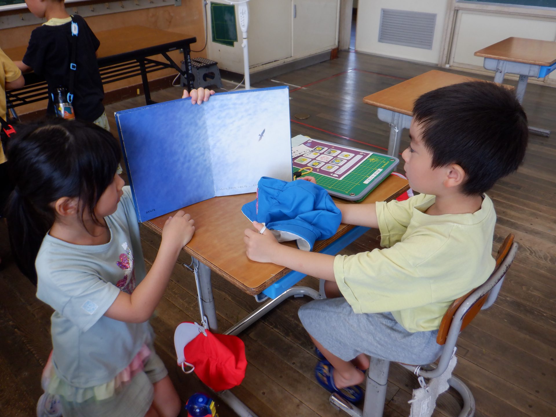 教室に入ると、ペアのお友だちの席に座らせてもらい、小学生になった気分!