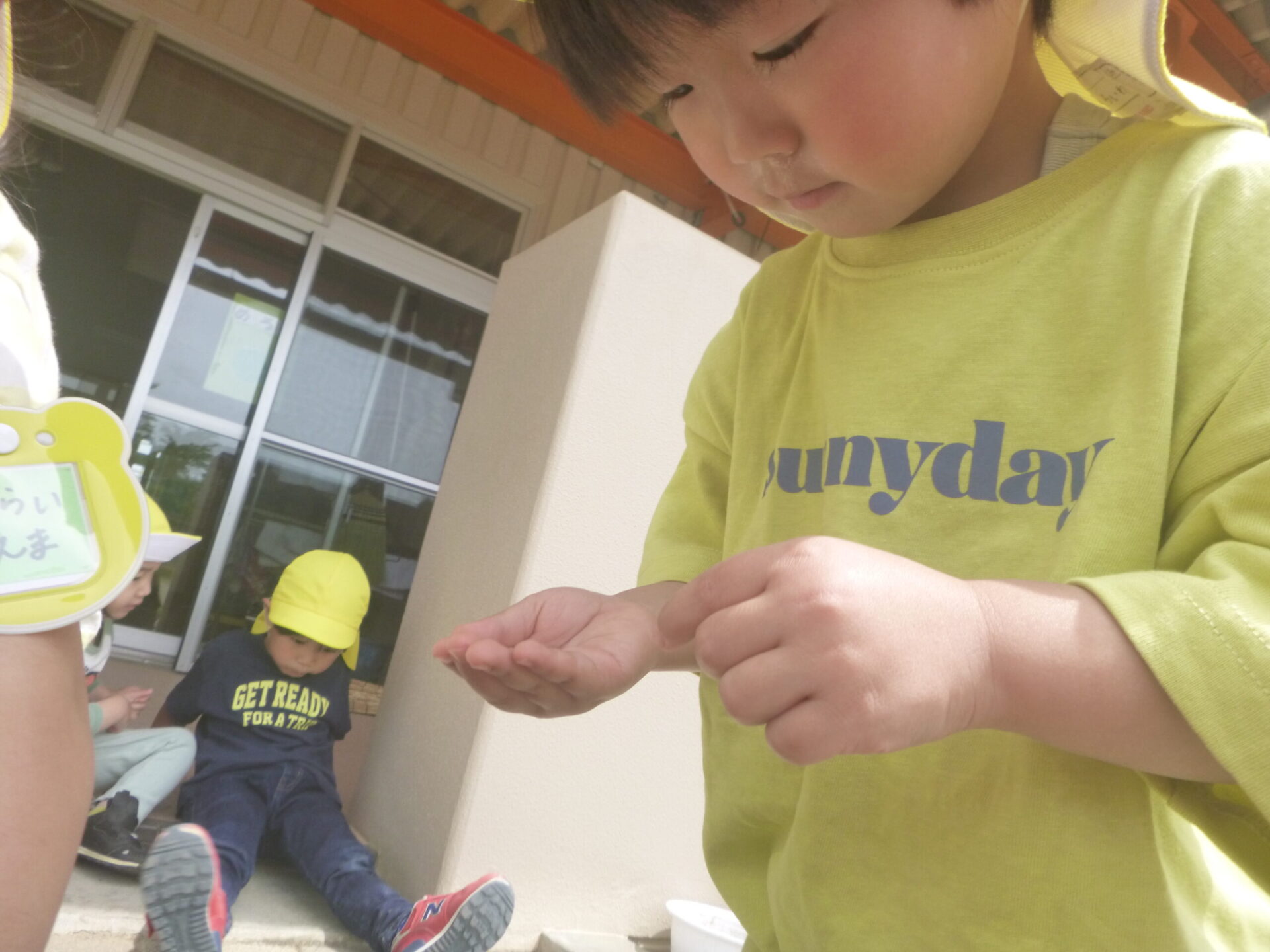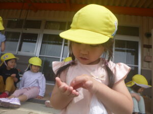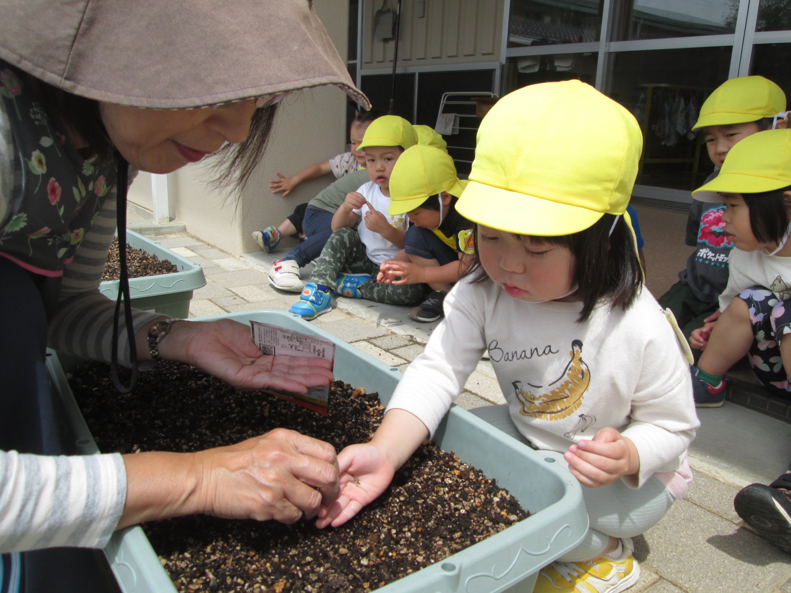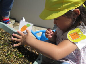 にんじんの絵本を読んだことで、興味を持った子ども達。小さな種を手のひらに乗せてこぼれないように土に蒔きました。