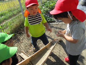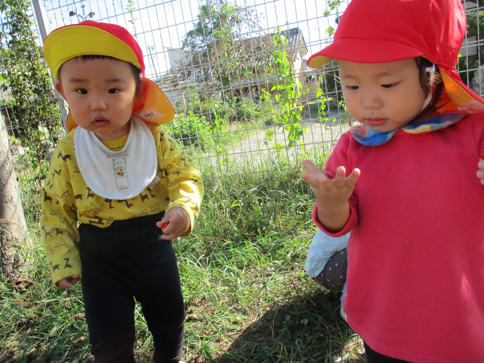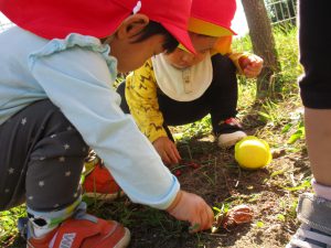 ・子どもたちが自然物を握ったり剥いたりしながら遊ぶ姿を見守り、保育士も一緒にすることで子どもが発見したことや面白がっていることを共感することが出来た。