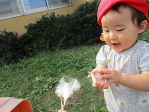 ・子どもが日頃から遊んでいる園庭や中庭の動植物が秋の物に変化していることに気付き、興味をもってほしい思いがあった。探索活動の時間を十分に確保し、保育士が「これ、何だろうね」と言葉をかけることで、子どもたちがハナミズキの実やガガイモの種子に気付き、触れたり集めたりする姿に繋がった。