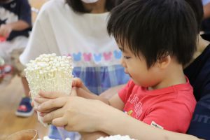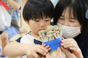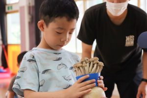 生産者さんにきのこの収穫の仕方を教えていただき、3歳児、4歳児、5歳児さん達は自分の手で収穫しました。ポットから採れた時は驚きながらも、嬉しそうでした。