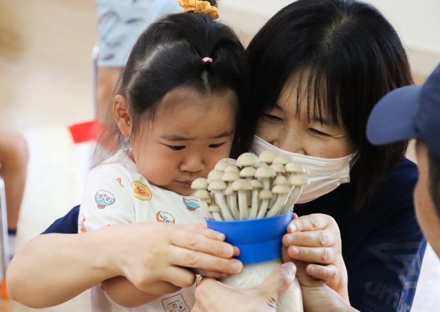 未満児さんは先生と一緒に収穫しました。ポットから出ているきのこはあまり見たことないからか、すこし不思議そうな顔をしている子もいました。