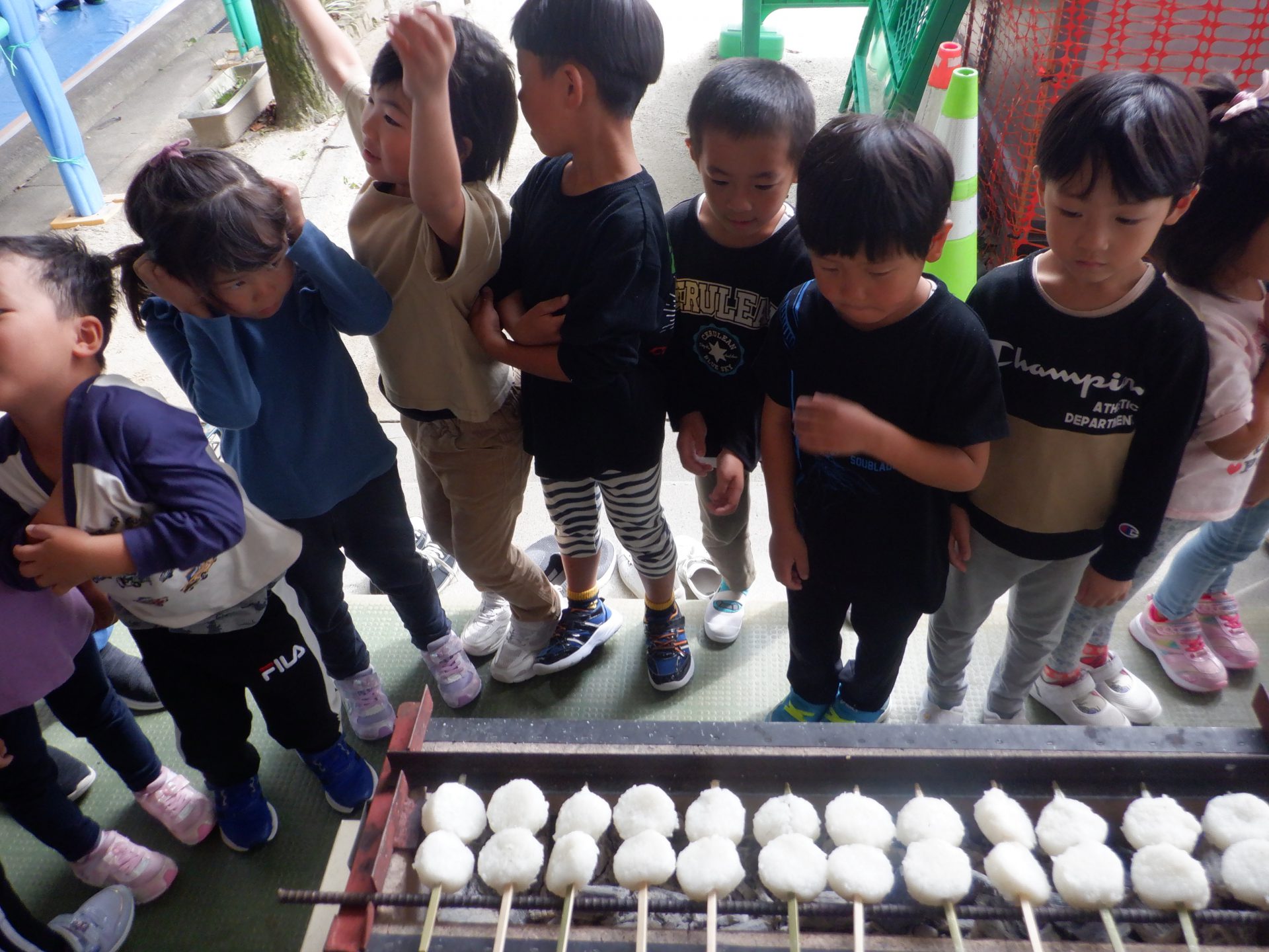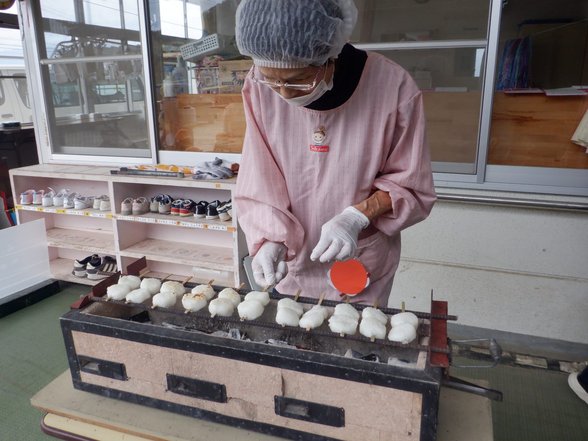 串にさした五平餅を女性部の皆さんが焼いてくれます。保育園中がいい匂い。