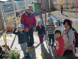 2歳児の子どもたちが、戸隠森林植物園のボランティアの会の方と一緒に、秋探しの散歩にレッツゴー!