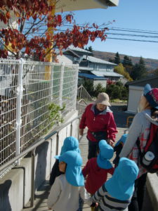 保育園内にある「はなみずき」の葉っぱが赤く色づいていました。普段から何気なく見ている景色も、言葉がけ一つで、子どもたちに秋を感じるきっかけになるんですね。