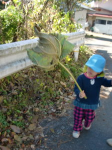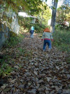 パリパリと落ち葉の上を歩く音を楽しみながら、坂道をのぼる2歳児。