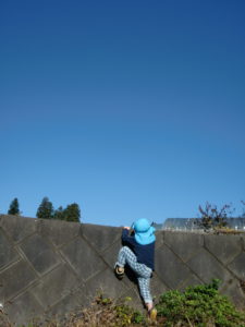 秋晴れの青空に向かって、のぼるよ。「ヨイショ」
