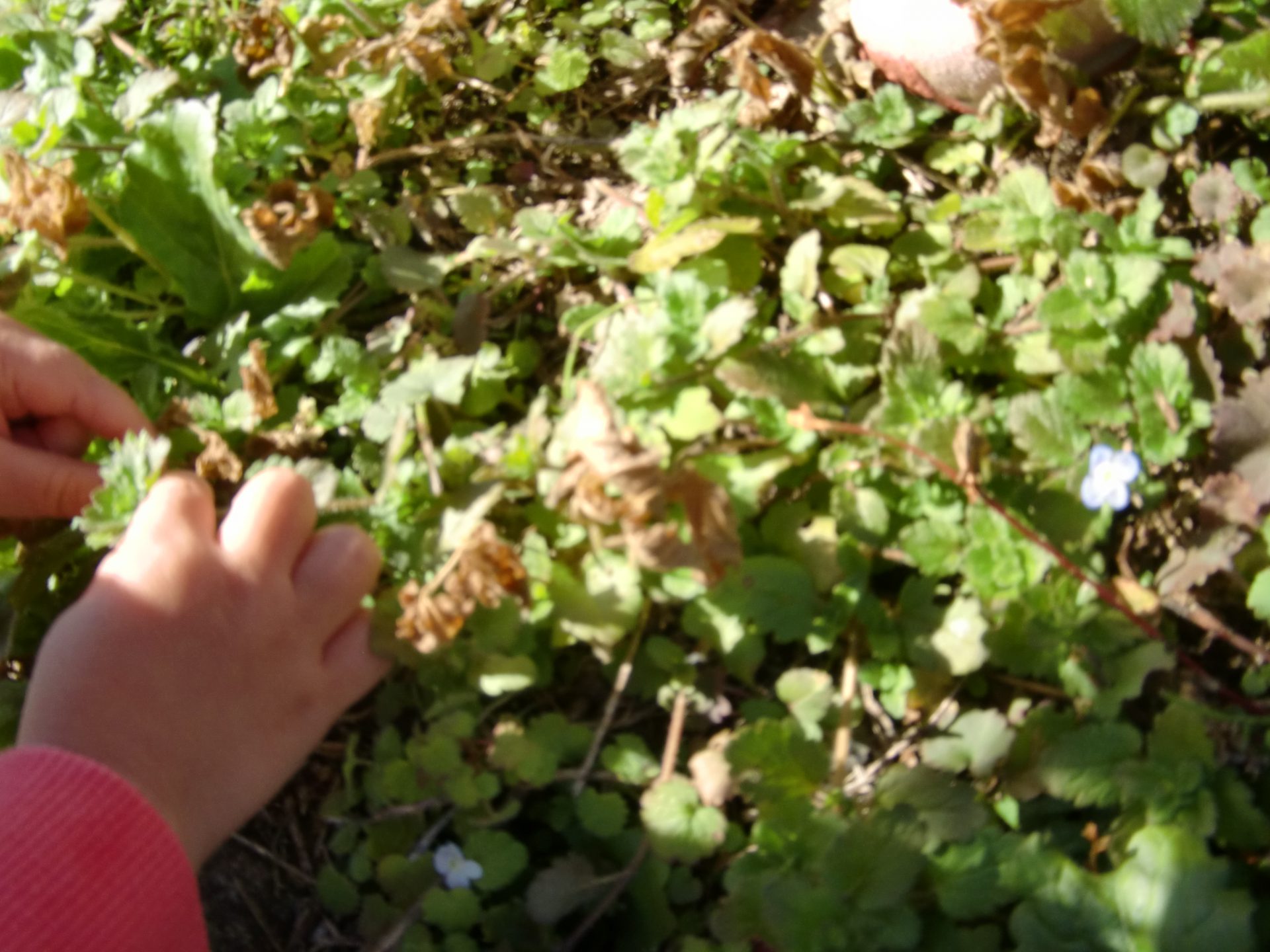 陽だまりには、小さなオオイヌノフグリの花を見つけました。落ち葉の間に、ひっそりと咲いていました。