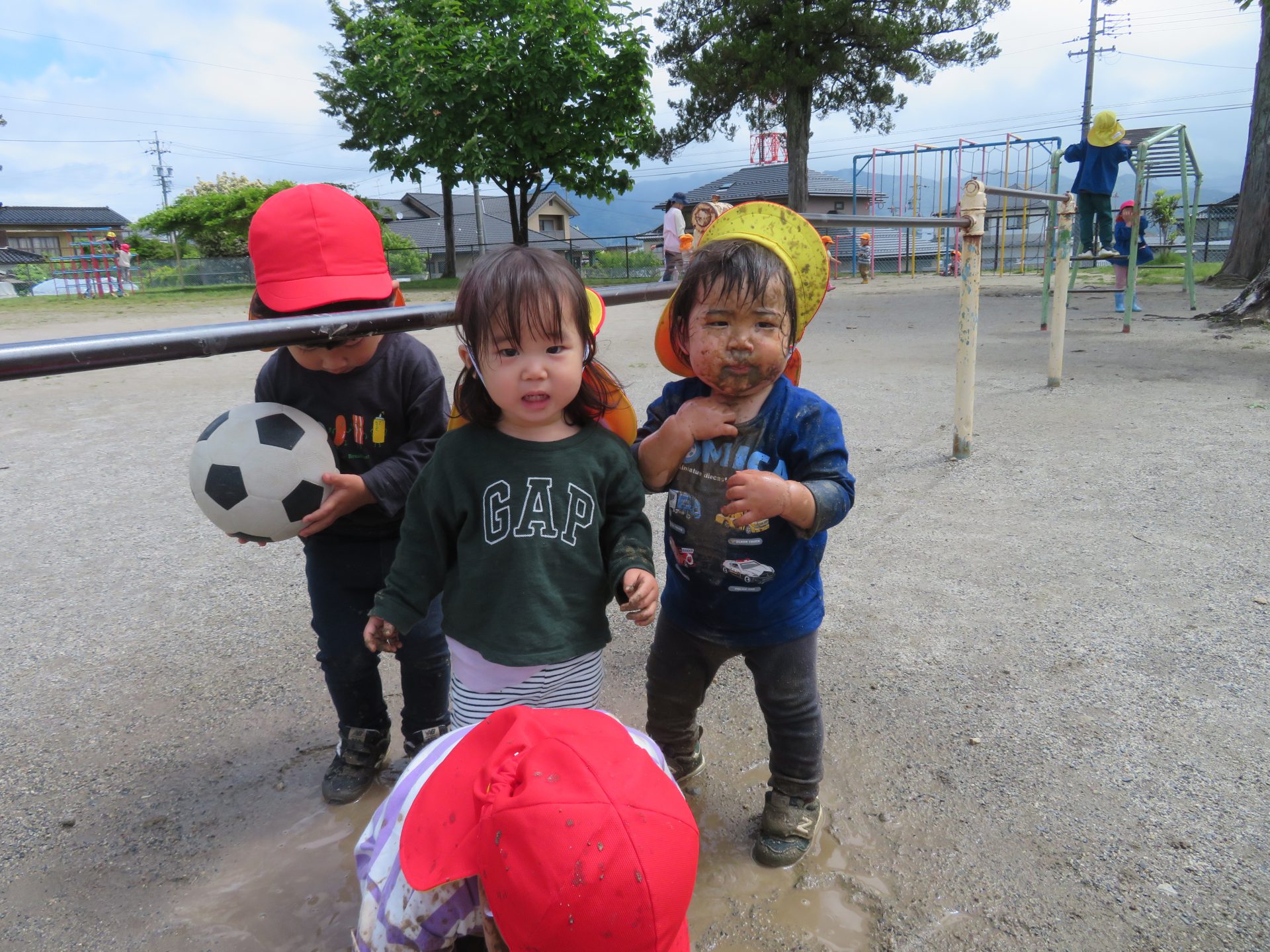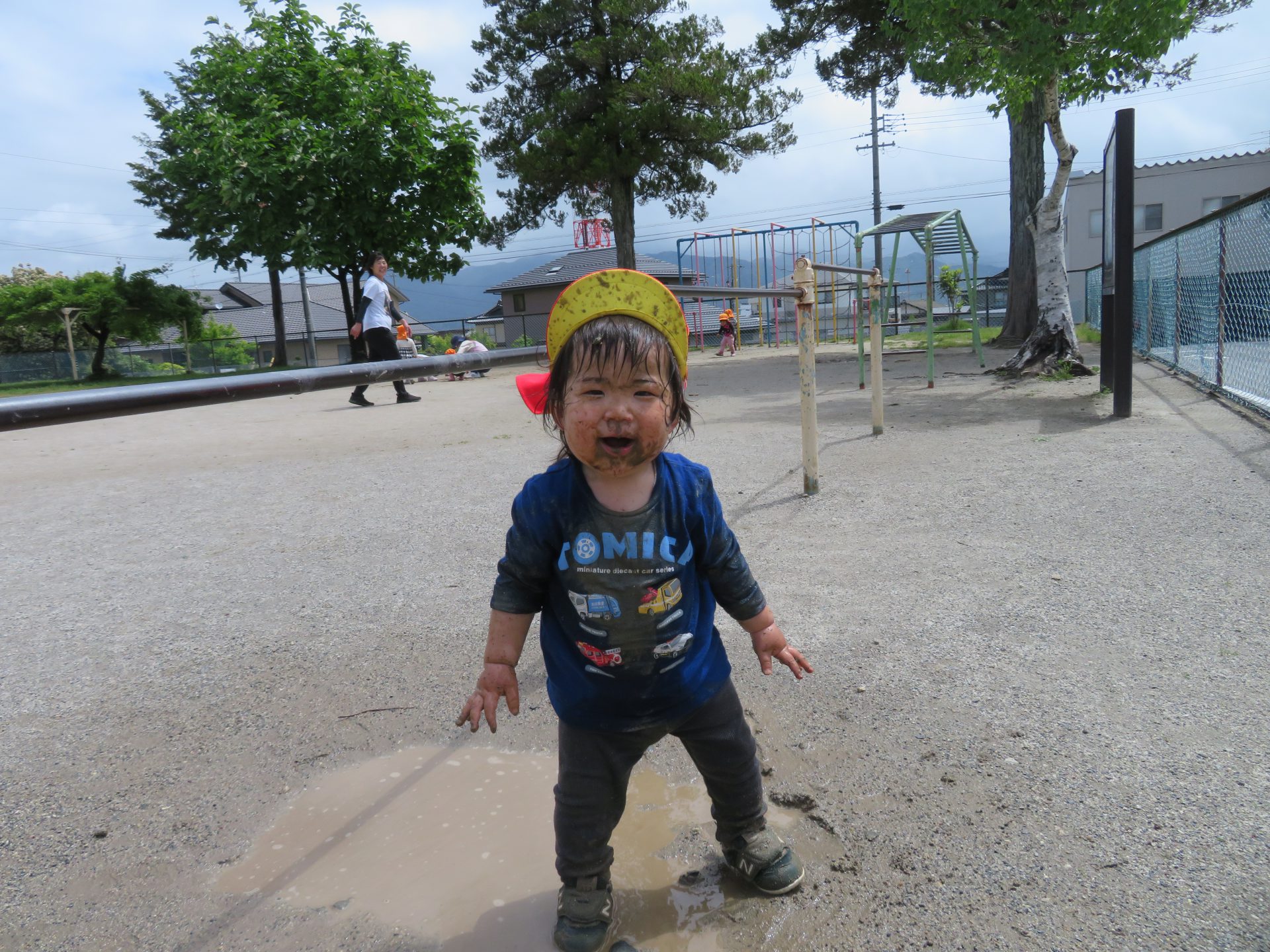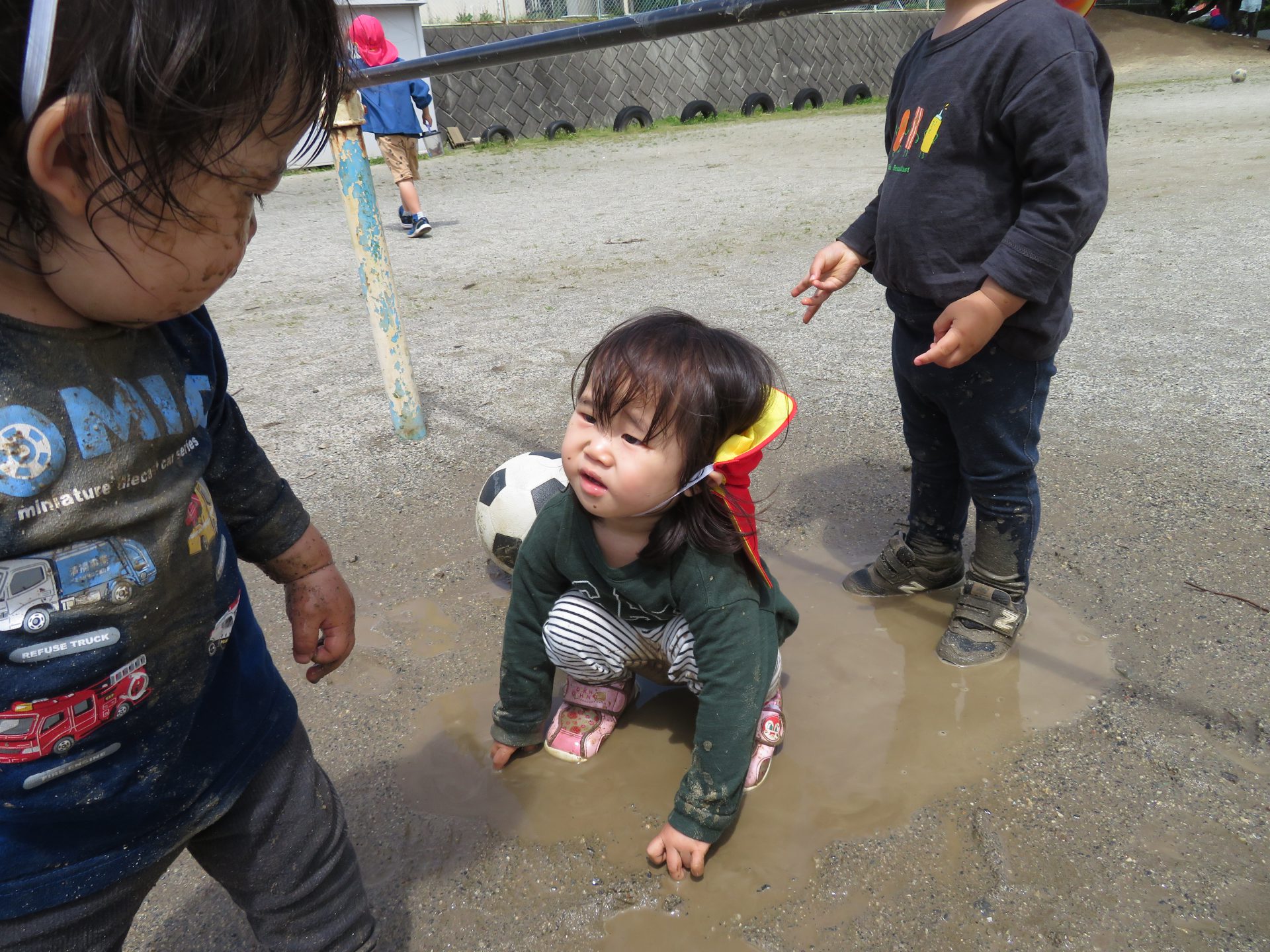 思っていたよりも大胆に遊ぶ子どもたち。全身ドロドロ。顔もビショビショになった子どもたちの嬉しそうな表情を見ることができ思う存分楽しんでほしいと見守りました。