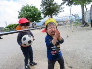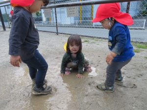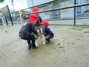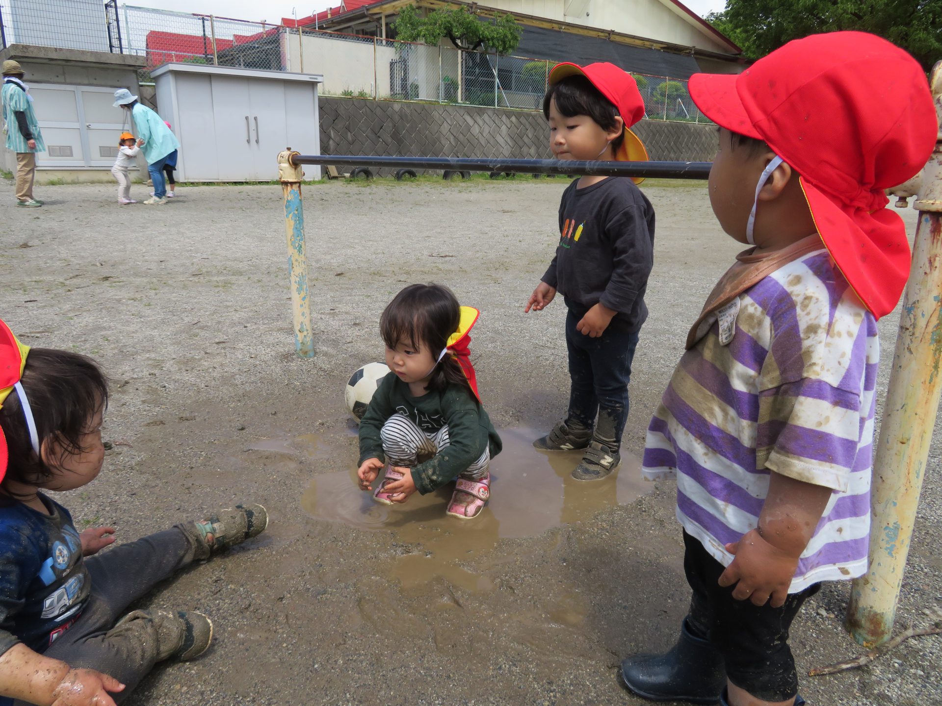 雨あがりに園庭に出て遊びました。鉄棒の下に水たまりを見つけひとりの子が近づいて汚れることも気にせず豪快に遊んでいました。