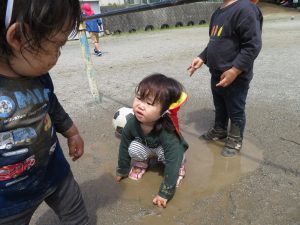 ・汚れることが嫌な子も友だちの楽しんでいる姿を見ると自分もやりたいと近づき、一緒になって水たまり遊びわ楽しみ始めました。友だちからたくさんの刺激を受けてこれからもいろんな経験を増やしていってほしいです。
