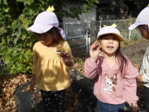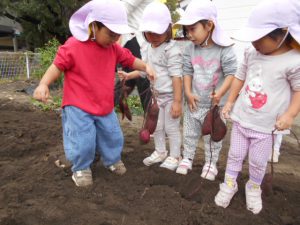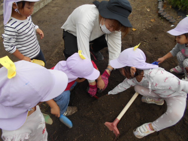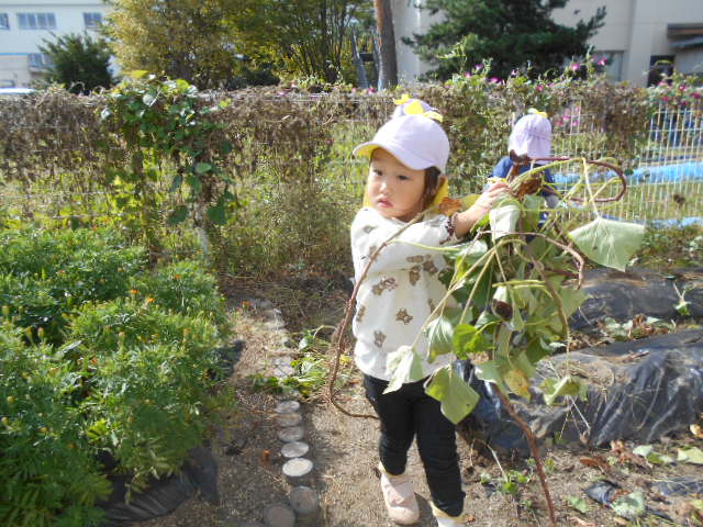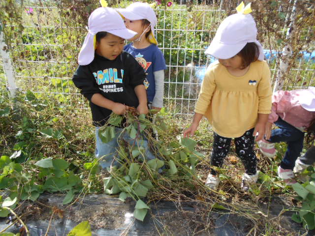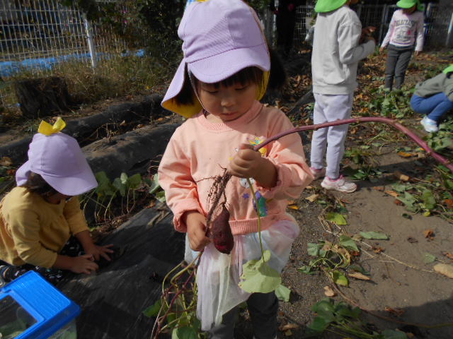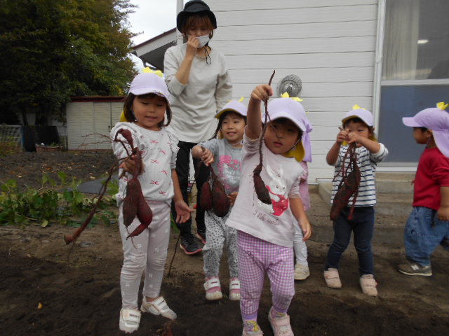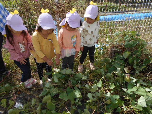 ・畑へ行くと沢山の野菜が育っていて「これピーマンだね」「トマトもおいしそうだよ」と会話をする子どもたち。さつまいもの葉を見て何が出来ているのかいつも不思議そうだったので、芋掘りした時は「さつまいもが出てきた!」と驚きと嬉しそうな表情でした。土の中でも野菜は育つ事に気づきました。秋の食材・味覚に興味をもち、味わっていけたらいいなと思います。
