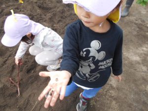 ・「このお芋大きい!」「これは小さいから赤ちゃんだね」「へびみたい長いよ~」色々な大きさや形のさつまいもに興味津々でした。
