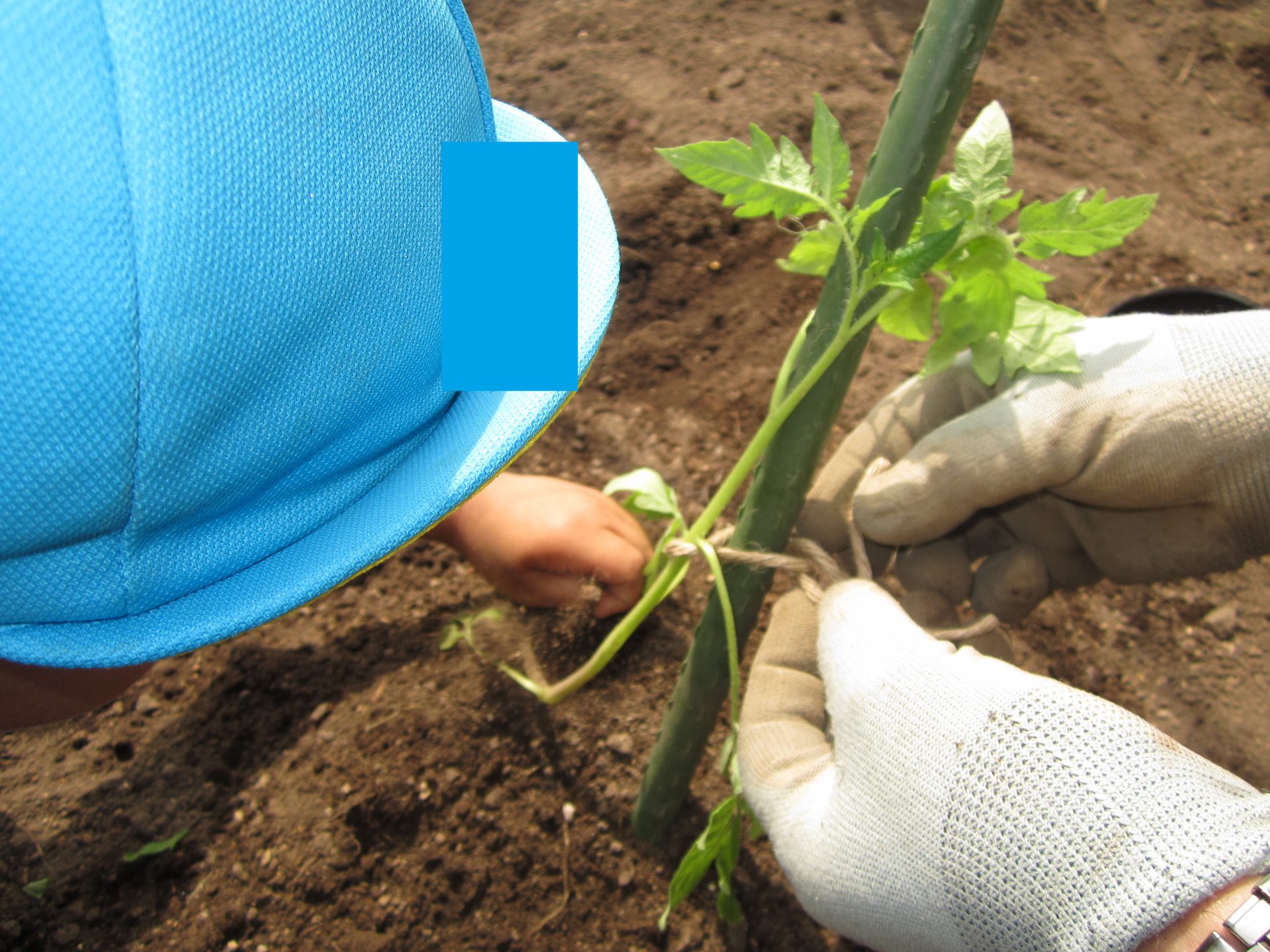 『トマトがお空に向かって大きくなれるように、棒を立てたりひもで縛ってあげるんだよ』