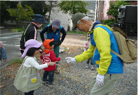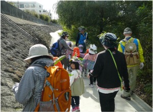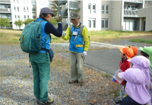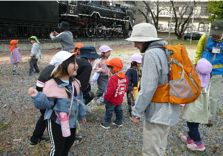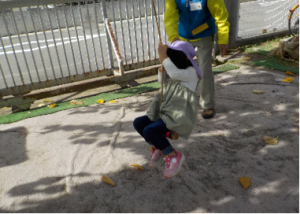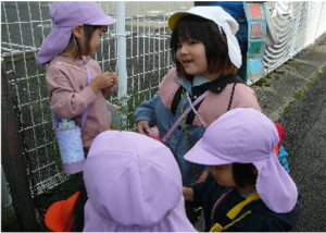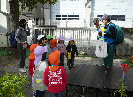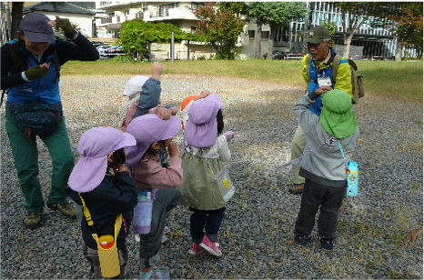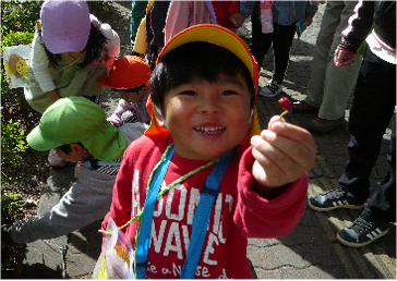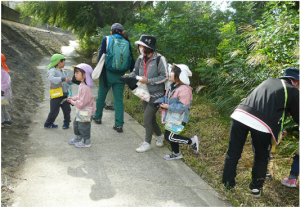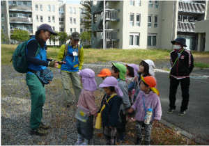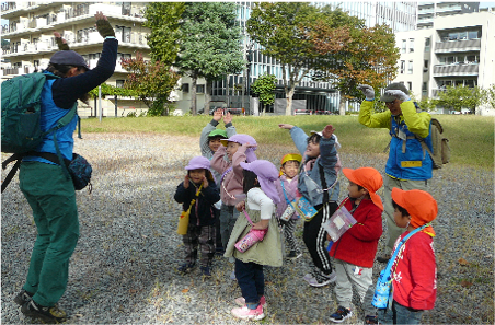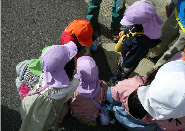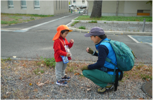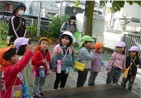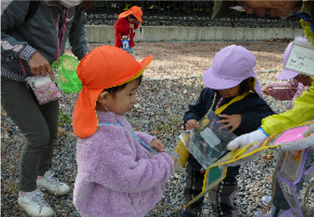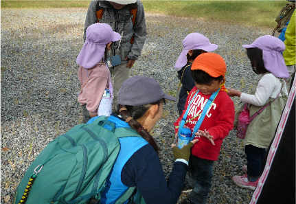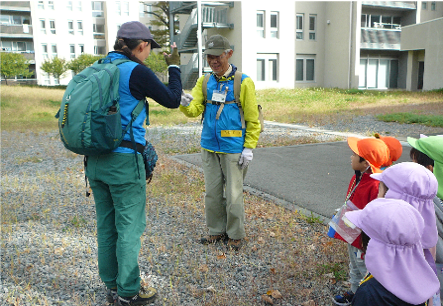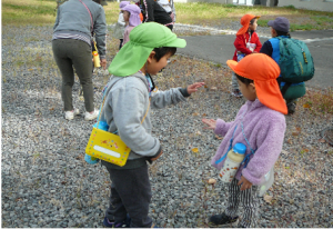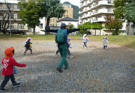 まずやってきたのは、園のすぐ近くにある広場。みんなで自己紹介を兼ねて「じゃんけんでごあいさつ」をしました。みんなニコニコ楽しそうです♪