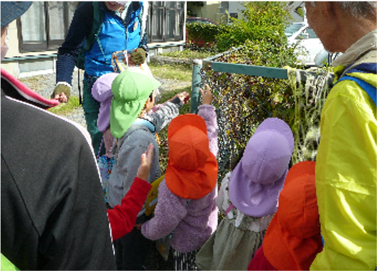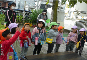 今日はやまぼうし自然学校から「がみちゃん」と「ひげじい」が来てくださいました。いつものお散歩コースで、一緒に遊んでくれるんです。どんな楽しいことするのかな?ワクワクしながら出発です!
