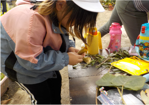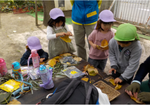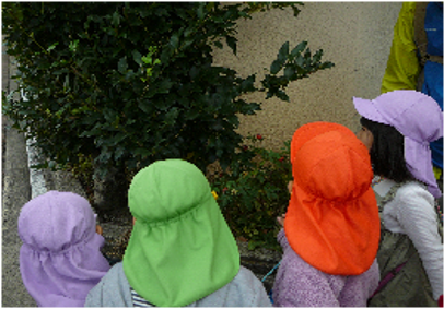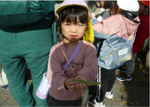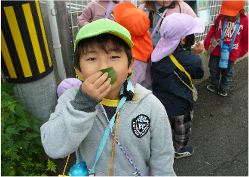 いろんな「匂い」も嗅いでみました。この葉っぱは・・「なんか、変な匂い・・」「えっ、いい匂いだよ!」同じ葉っぱでも、感じ方はそれぞれです。