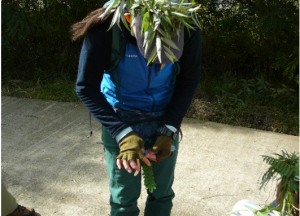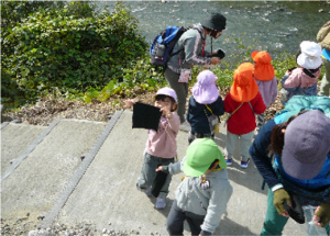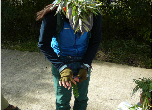 川の道に着きました。ここからは黒いフェルトを使って「くっつく種探し」です。どこにあるかな?