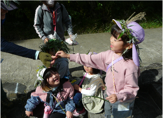 道中で見つけた柳の葉っぱでオシャレに秋の装い。みんな素敵ですね!
