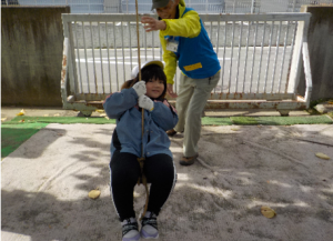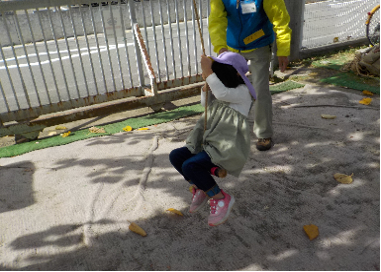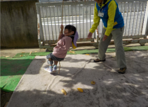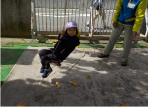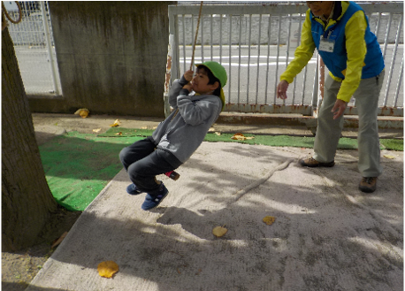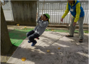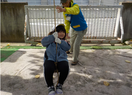 園に戻って、年中さん年長さんはブランコ遊び。木にひげじいがロープをかけて作ってくれました。しっかりつかまって・・みんな上手に乗れたね。