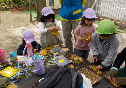 この木の葉っぱでコサージュを作ったり、種がクルクル回りながら落ちるのを楽しんだりしました。たくさん遊んで、いろいろ感じた、楽しい研修になりました。