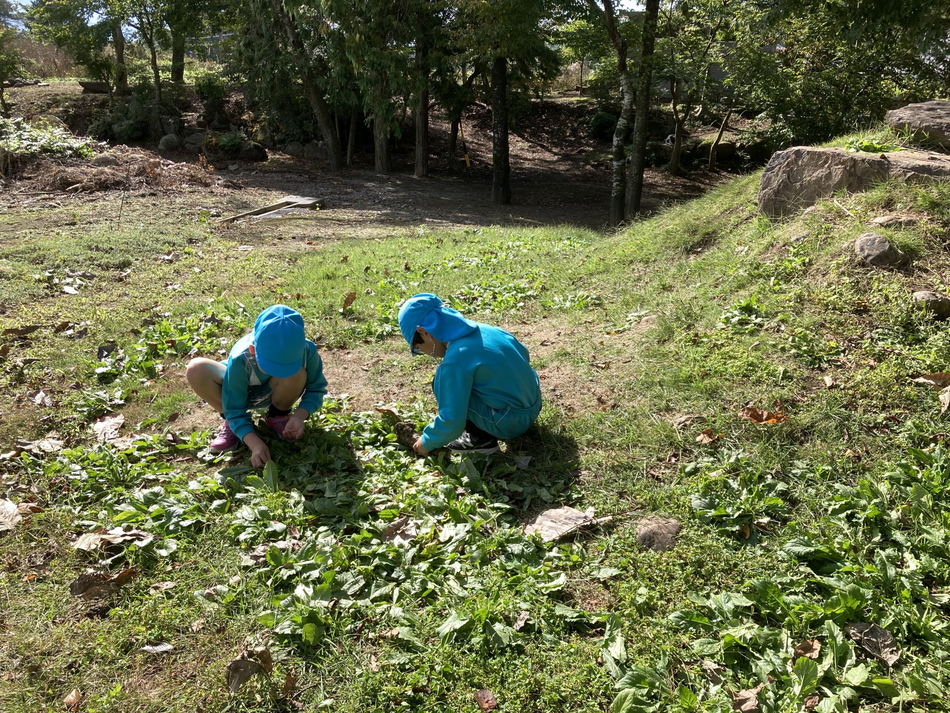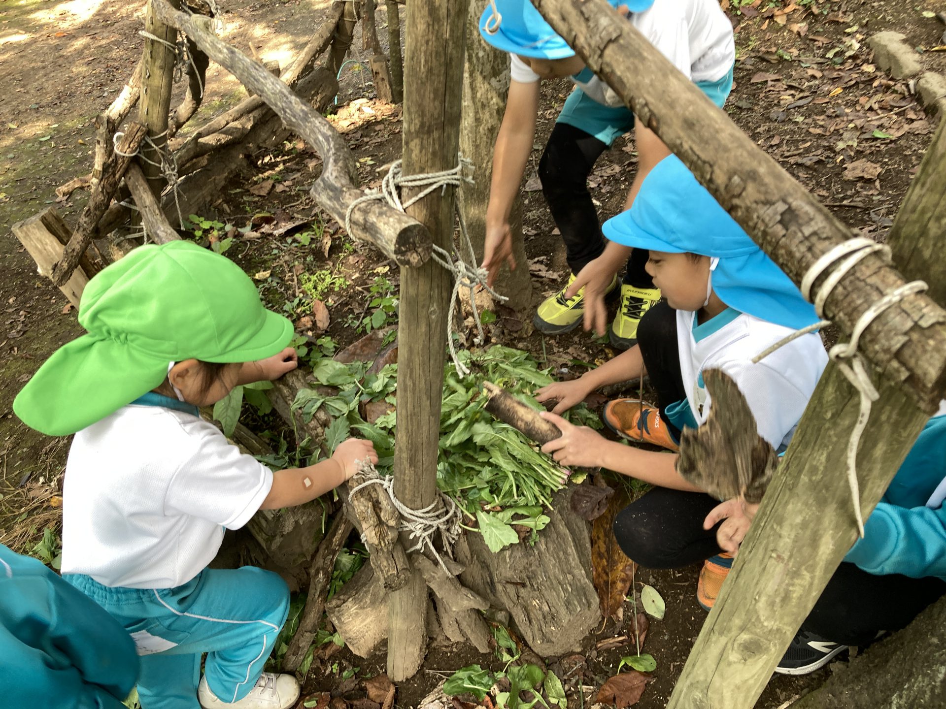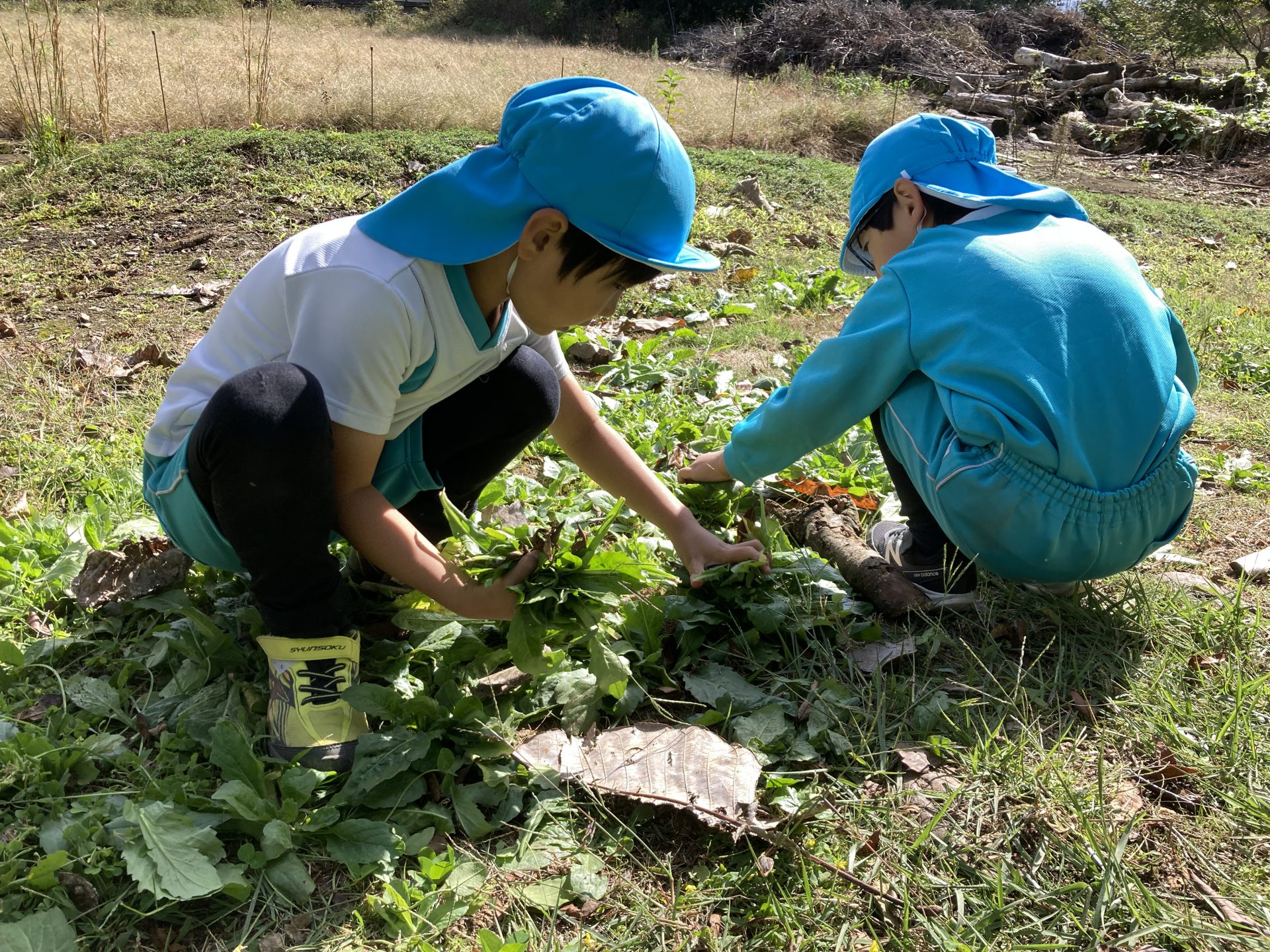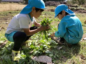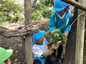 「ほうれんそうだよ!!」と両手いっぱいになるほど取っていた子どもたち。ヒミツキチに持って帰り、