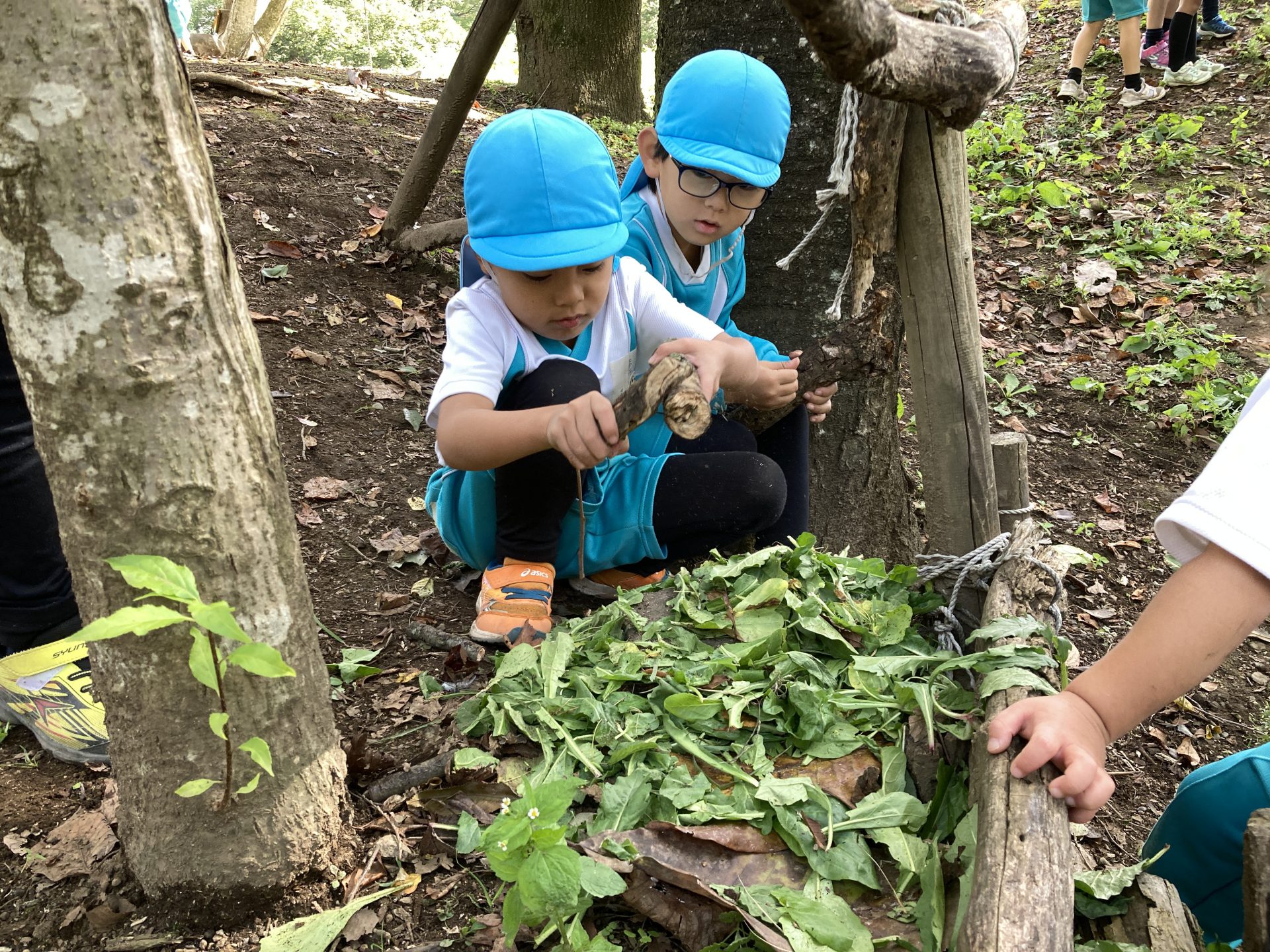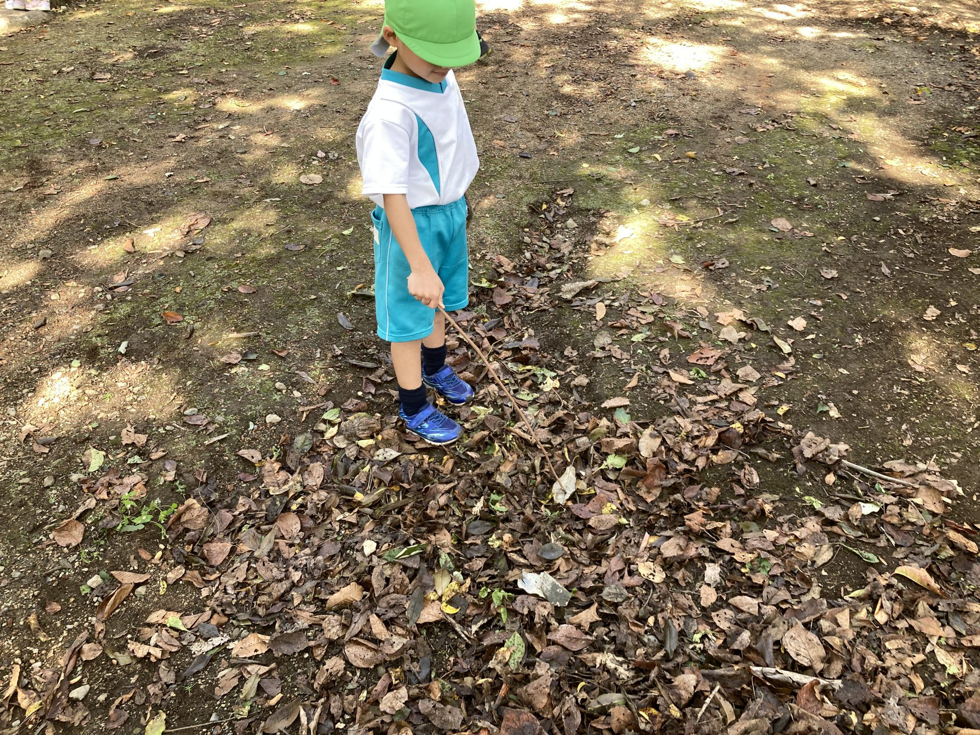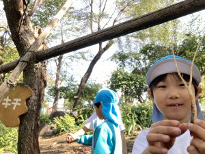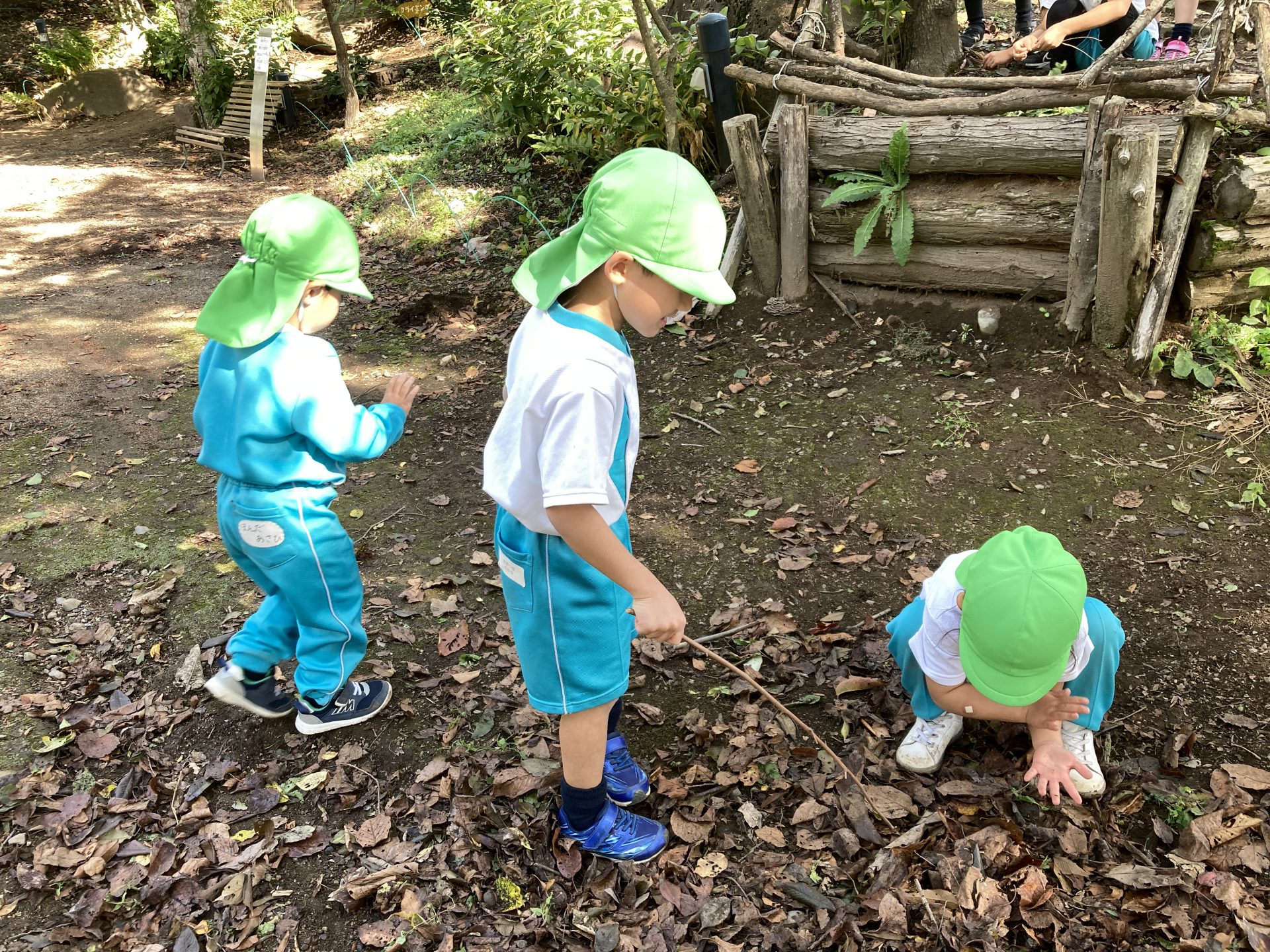 こっちでは、落ち葉と枝を使って『魚釣り』を楽しんでいます!!