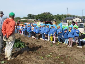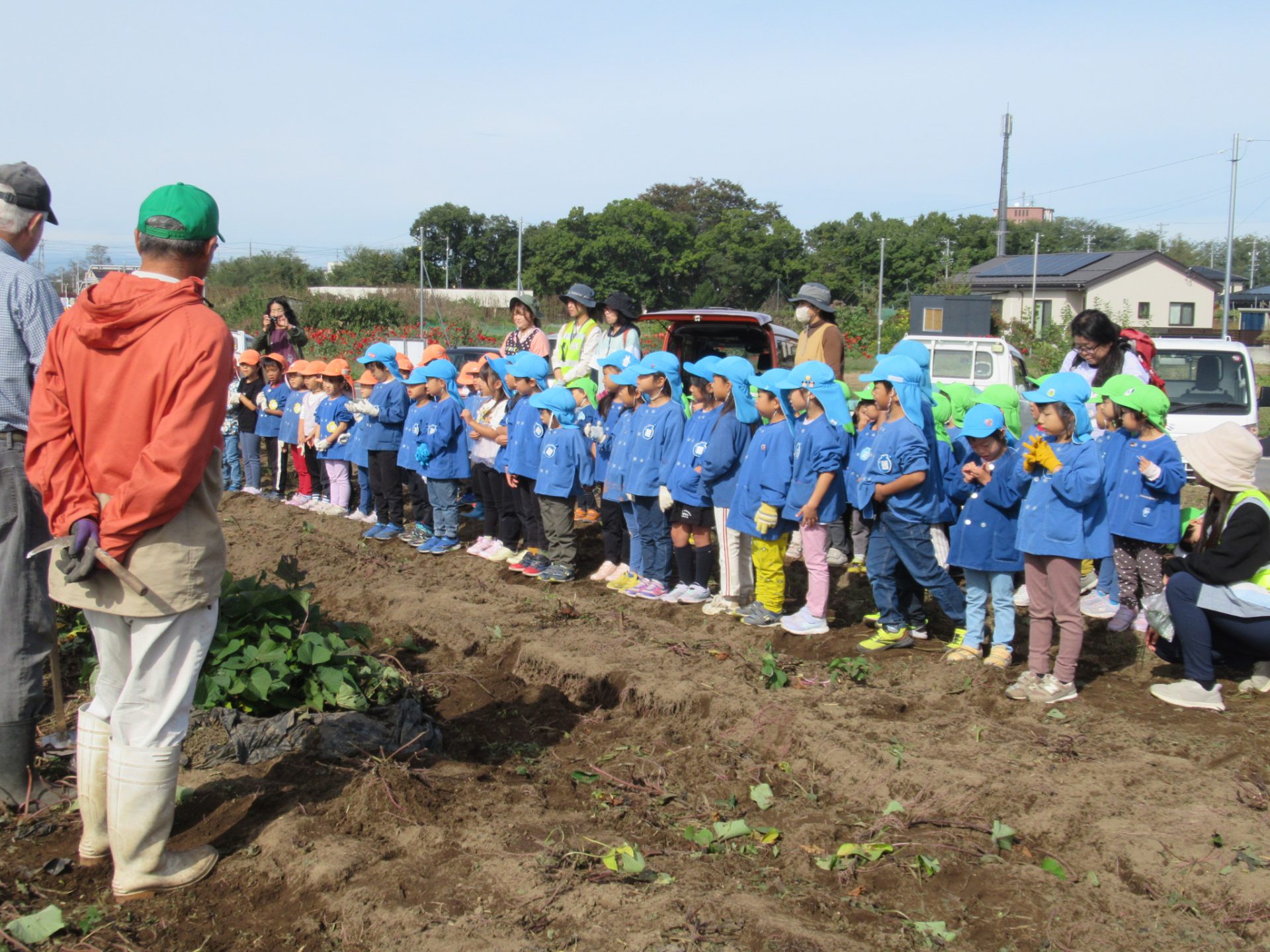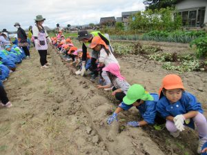 じゃがいも掘りを経験していた3.4.5歳児さんたちは「土をこうやって(かきわけて)掘るんでしょ?」「下の方にいっぱいあるんだよ」と話していました。