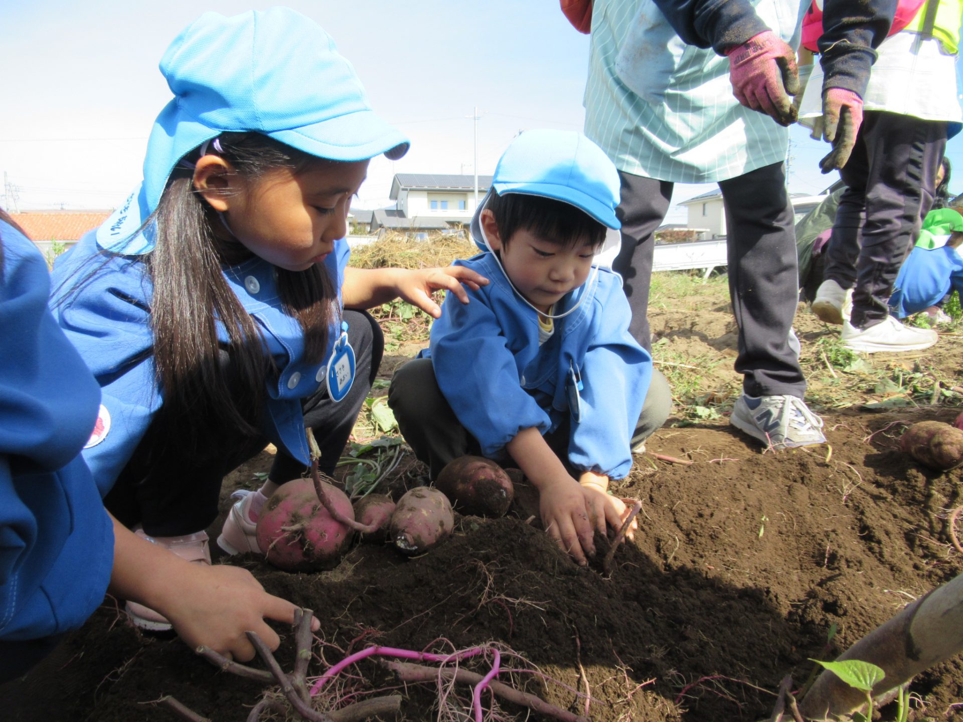 ・芋掘りを経験することで自然と協力し合う子ども達の姿が見られました。掘らせてもらう中で、異年齢の関わりがたくさんありました。保育士が伝えなくても、自然と声を掛け合い、助け合う子どもたち。やりとりが広がる良い機会となりました。