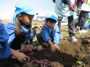 ・「こんなところにお芋あった!」蔓があったところから離れたところにさつまいもを見つけた年少児さん。「どうしてこんなところにあるのかな?歩いてきたのかな?」と考えていました。