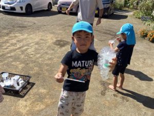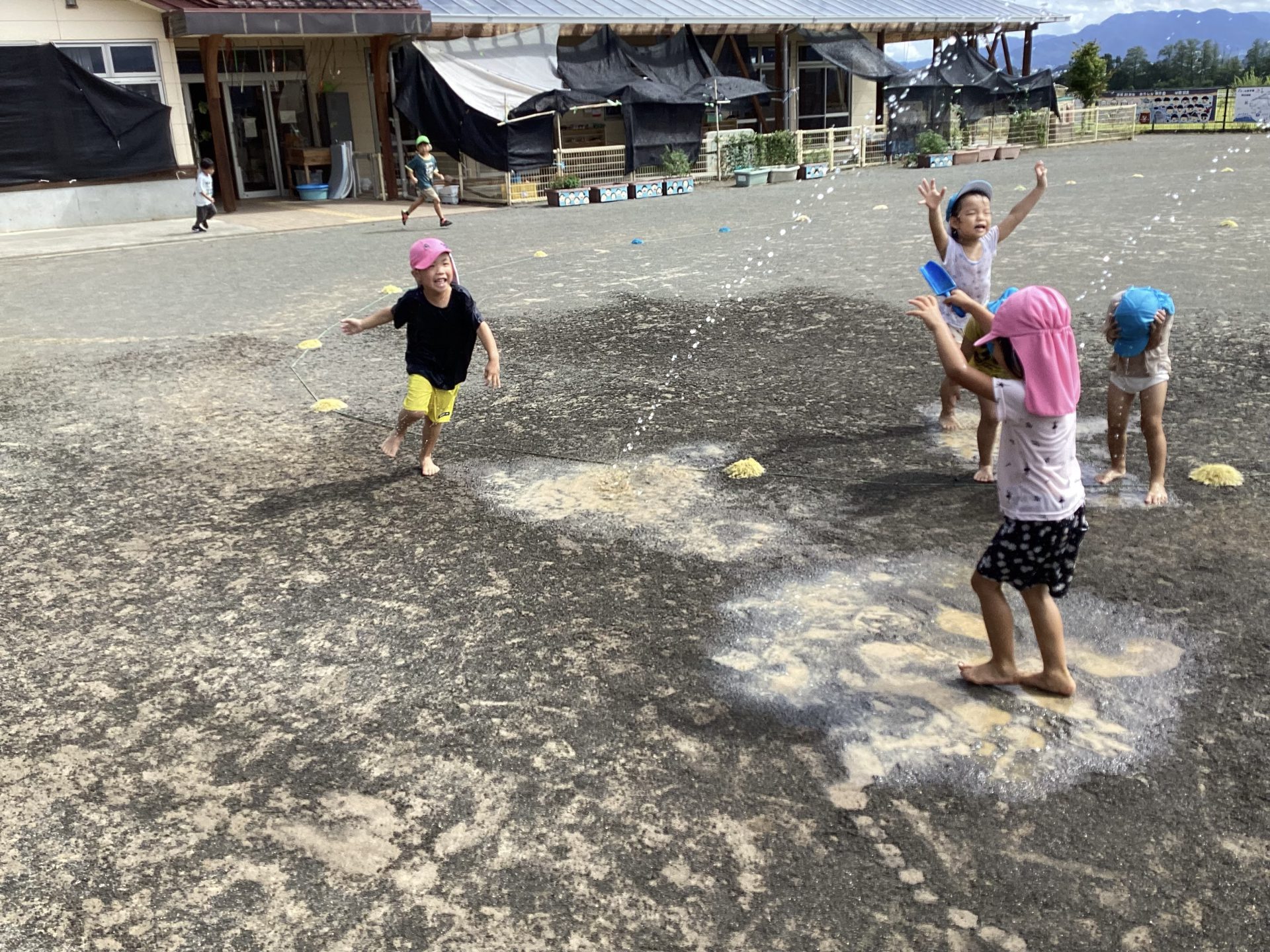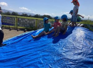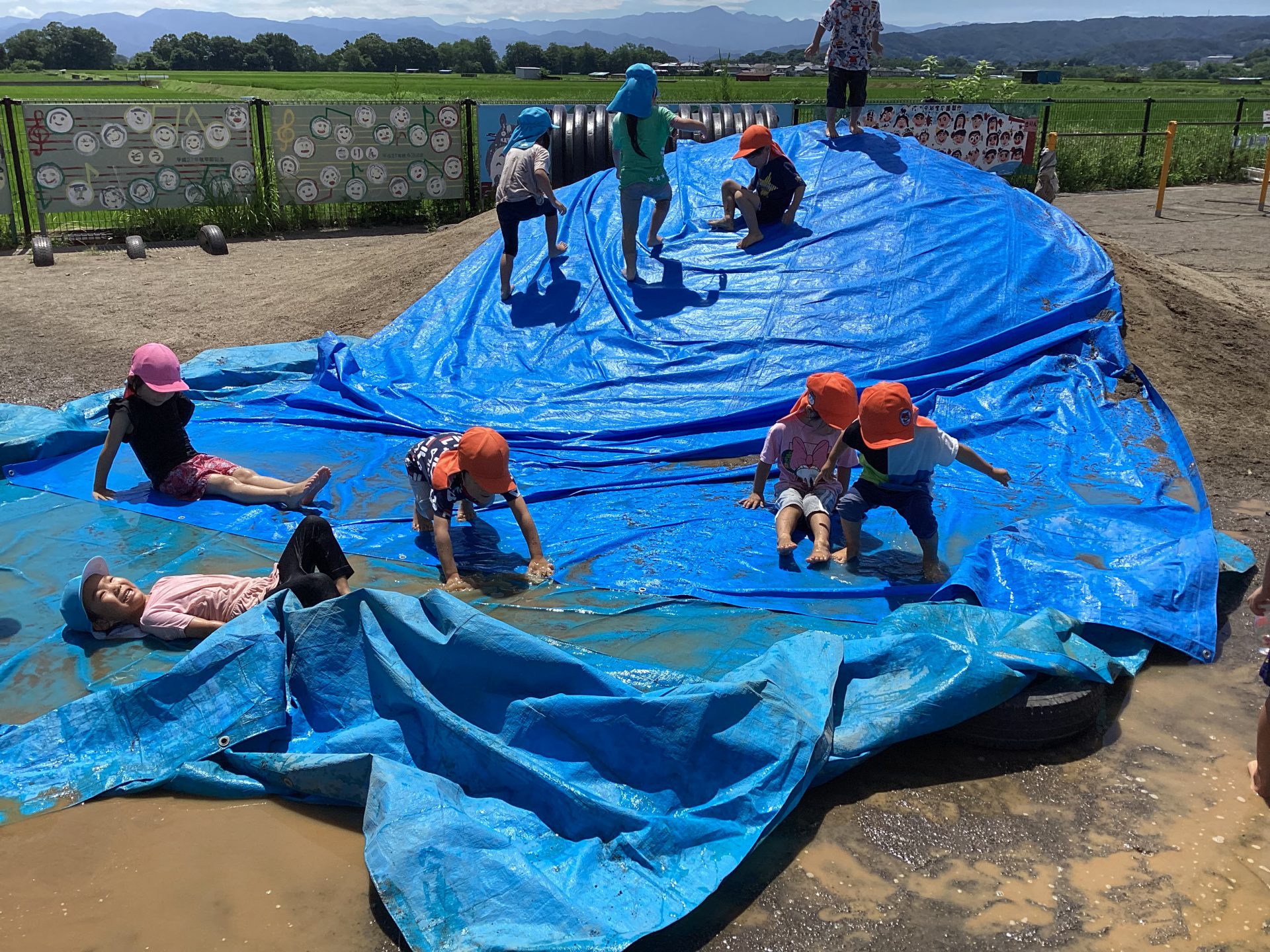 ウォータースライダーでは、初めは怖がっていた子も何度か滑るうちに滑り方が上手になっていたり、どうやったら速く滑れるかを研究する子がいたり自分で工夫をして楽しんでいました。また暑い日だったので、水を使った遊びは大人気で、水の感触や冷たさを感じられる遊びとなりました。