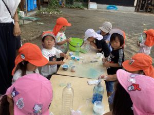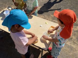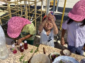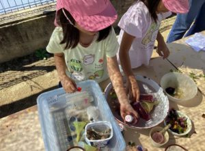 色水遊びは夏の暑さの中、水に触れ、気持ちよさを感じながら色が出たり、変化する様子を楽しむことが出来ました。今後も継続して異年齢間の交流をしたり、自然に触れたりして、遊びを楽しんでいきたいと思います。