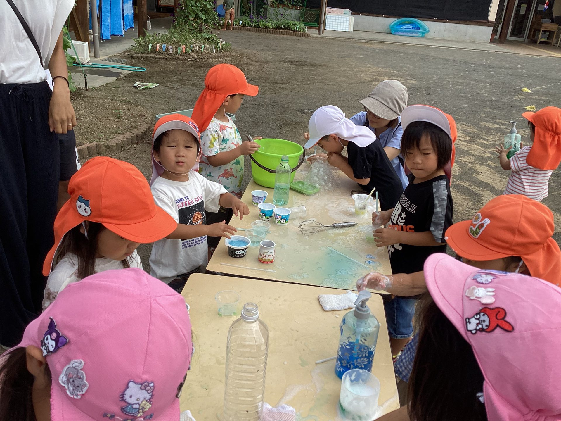夏のハッピータイムでは、色水遊びや泥遊び、ウォータースライダー、泡遊びなど様々な遊びを楽しみました。