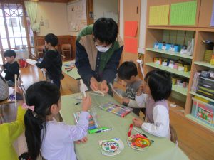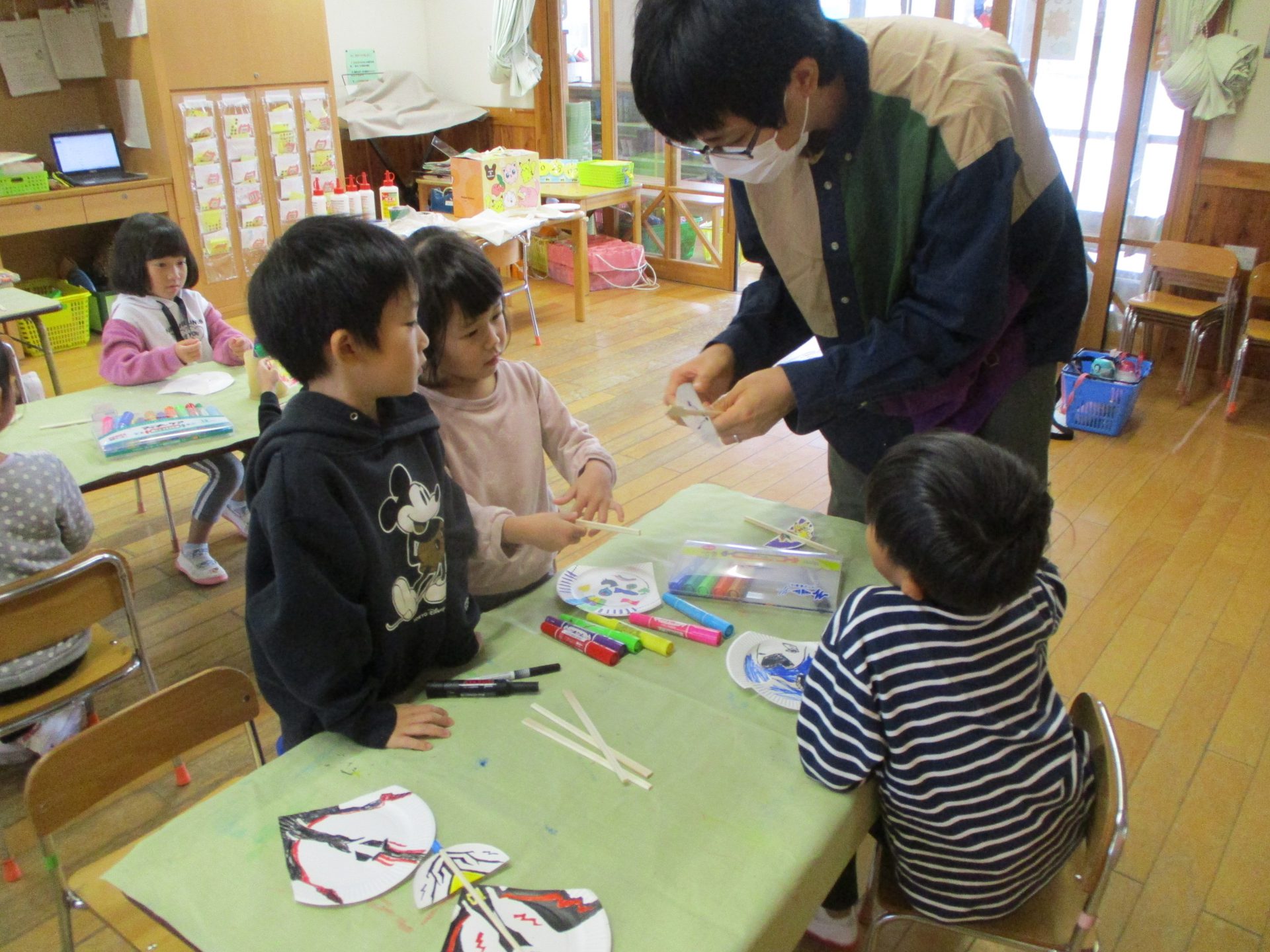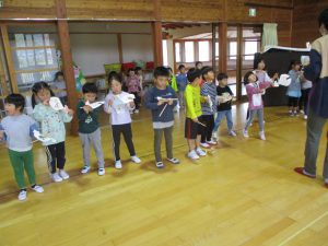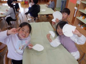 昨年度から紙飛行機で遊ぶことが大好きだった年長児。 ボランティアの和平さんに紙皿飛行機作りを教えていただきました。