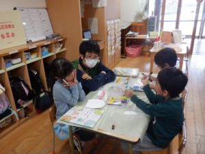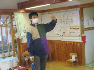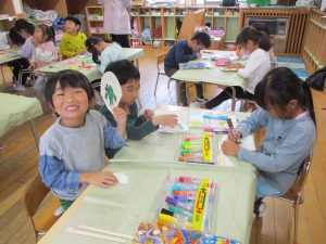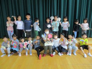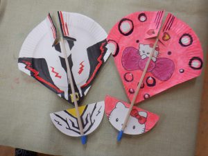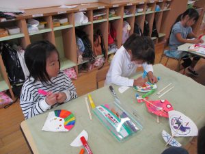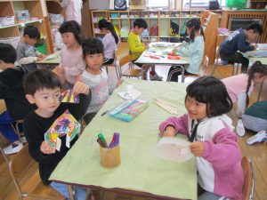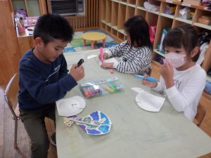 ・元々好きだった紙飛行機作りから、紙皿飛行機作りとつなげたことでより興味をもっていました。 ・割り箸、紙皿、ボンド、クリップ、油性ペン、両面テープ、はさみ、ビニールテープなどの様々な素材や用具を使いましたが、”作ってみたい!”という気持ちで、時間を掛けながら最後まで作り上げることが出来ました。 ・作り方で難しい部分もありましたが、ボランティアの方に優しく教えていただきながら一緒に作り上げることを楽しんでいました。 ・年長児が遊んでいる様子を見に来た年中児が「つくりたい!」と話していたので、一緒に作ってみたいと思います。