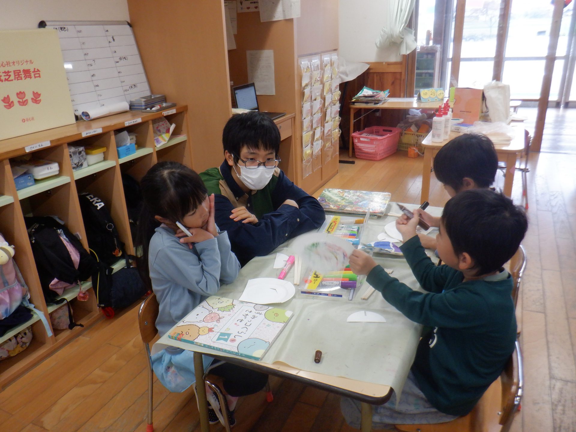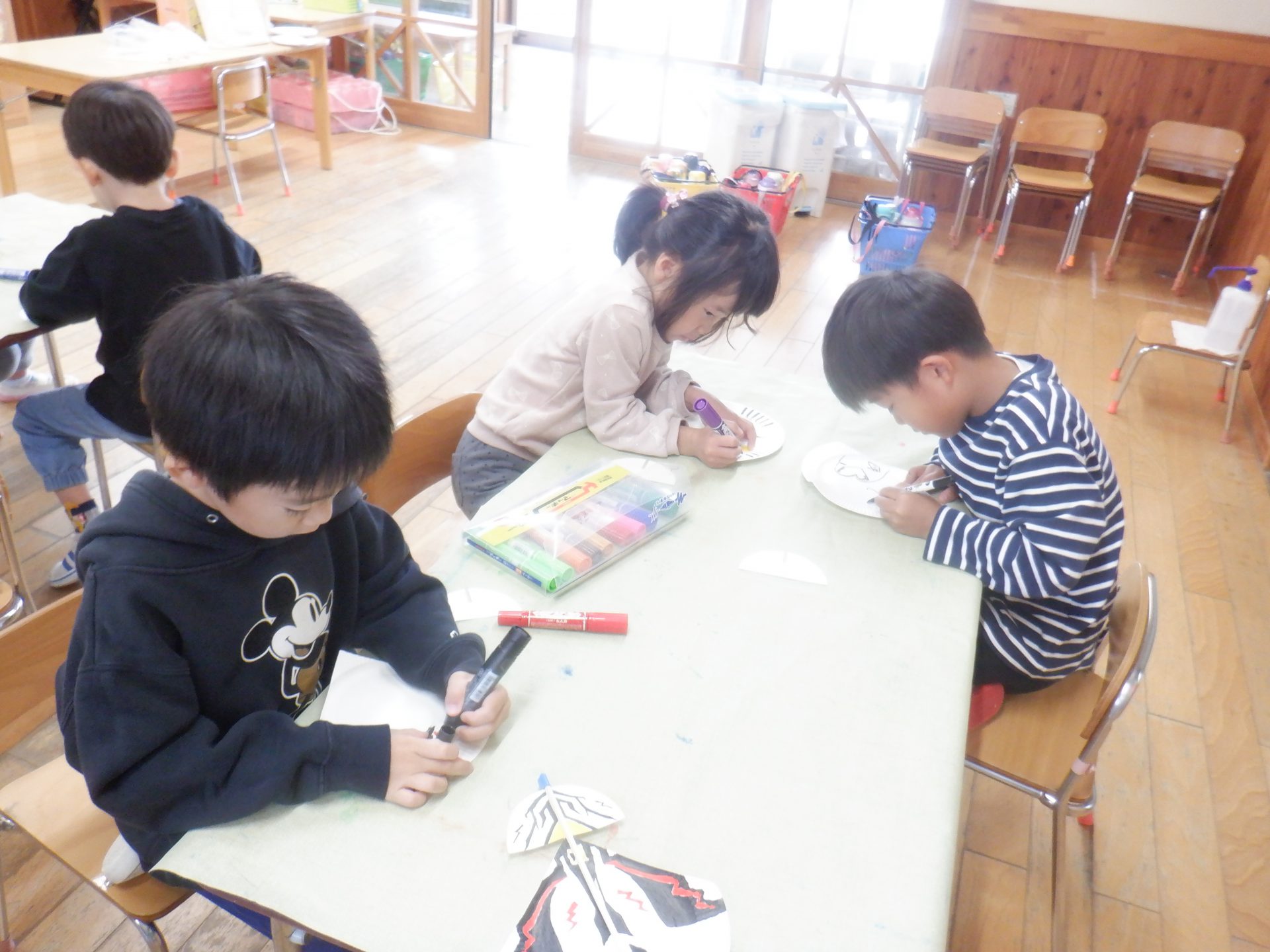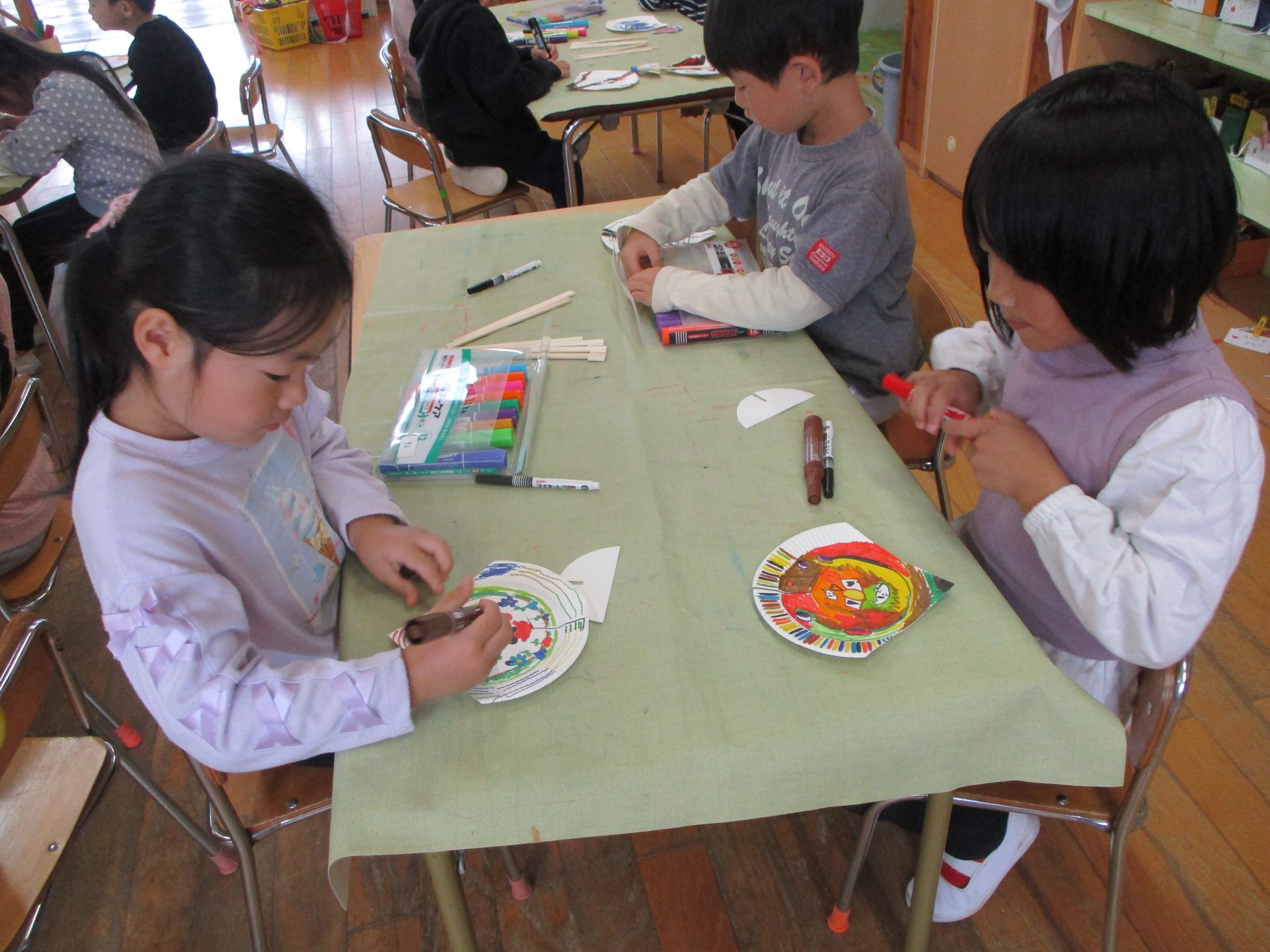 最初に紙皿にペンで好きな絵を描いたり、色を塗ったりしていきます。